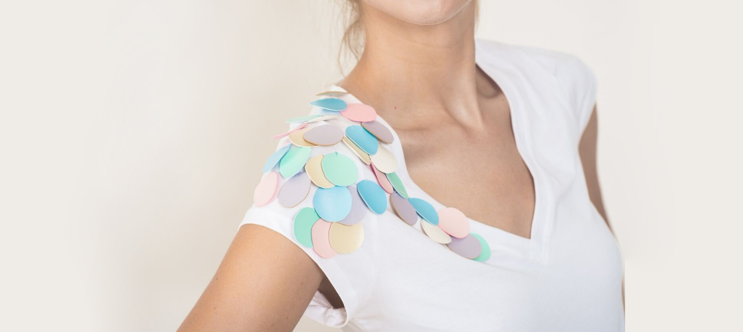 At this point, all you need to do is sew them onto the garment and create the desired effect, one polka dot after the other. You can decide to use tone-on-tone thread, like I did, or you can play around with contrasting colors.