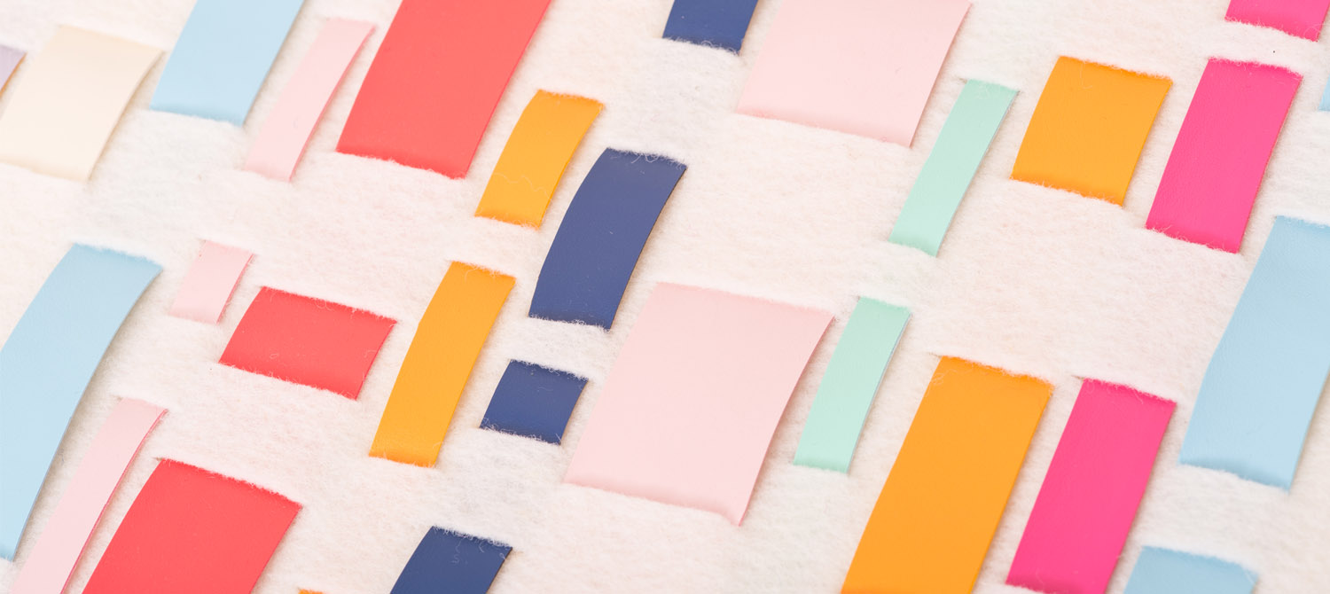 Keeping in mind the measurements that you chose for the felt placemat. Outline and cut the faux leather into stripes of different lengths, but always long enough to go over the edge of the placemat. As you will see, I am going to position them parallel to the shorter side of the felt placemat. So my stripes are between 37 and 40 cm in length. The width of the stripes are also different. I feel that gives the piece more character. Some stripes are 1cm wide, others are 2.5, others are 3cm. On our website you’ll find faux leather ribbons of different widths. So if you want to save some time and be sure to have nicely cut straight stripes, you can just go ahead and buy the different sizes to alternate.