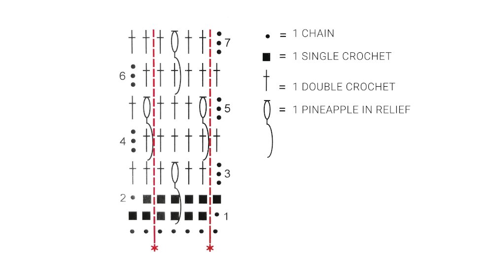row 7: chain 3, * 1 double crochet in each of the following 2 stitches, 1 pineapple in relief, 1 double crochet on the following stitch *, 1 double crochet on each of the last 2 stitches