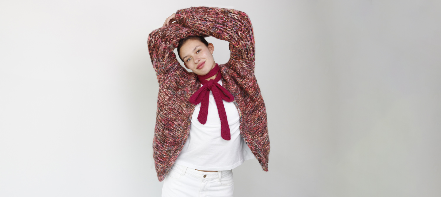 Here we paired the bow with a cardigan with worked sleeves made with Piuma yarn in the Monet color.