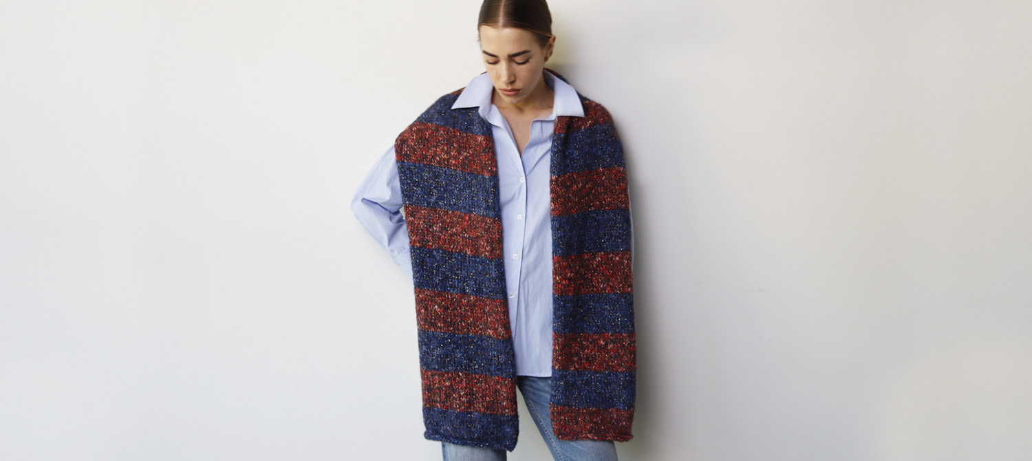 Here, we propose a striped scarf, and while that sounds simple, it transforms into something special with yarn N.5. This yarn, Made in Prato, consists of 5 twisted strands of alpaca, wool, and a touch of lamé. The rest is right before your eyes: a simple scarf becomes an accessory worth admiration.