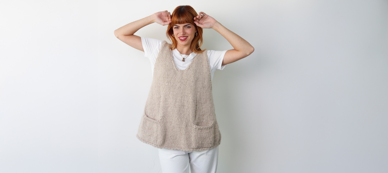 The vest is worked flat in 2 pieces, back and front. The edges are worked as you go, the front pockets are worked at the end by picking up the stitches that were put on hold.