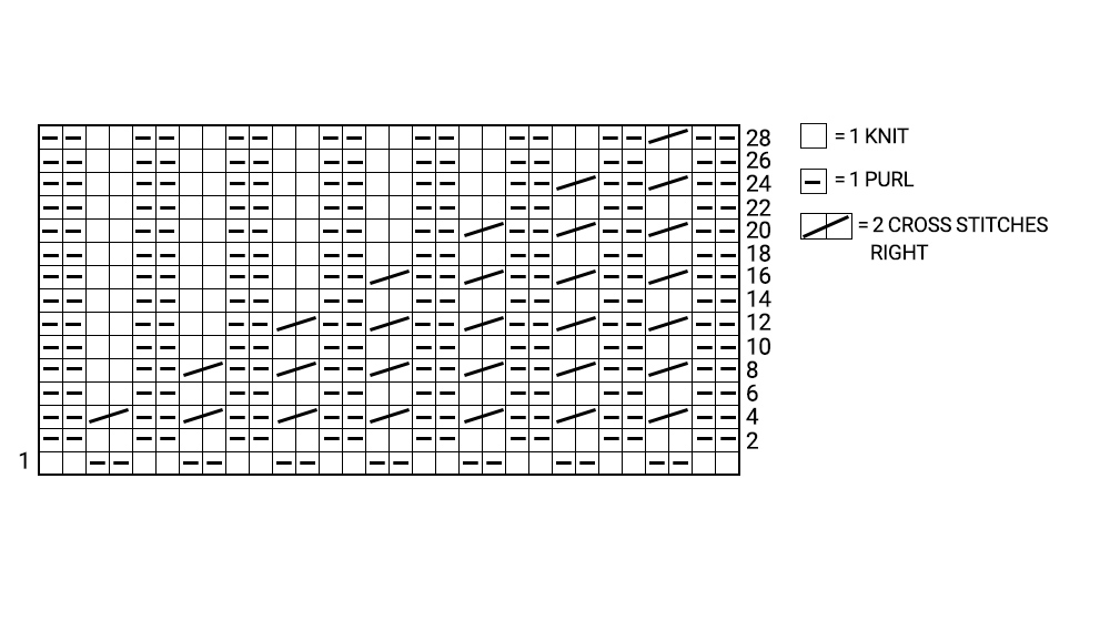 row 28: purl 2, cross stitch 2 to the right, *purl 2 and knit 2*, repeat from * to * 6 times and finish with purl 2