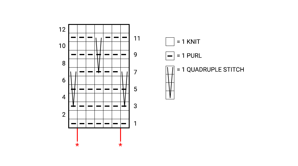 row 11: * purl 3, 1 quadruple stitch, purl 2 * finished with 1 purl
