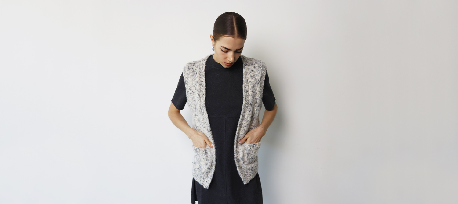 Eseguite una tasca su ciascun davanti come segue: con i ferri n° 7 EU / 10½ US sul diritto del lavoro riprendete le 15 (15, 17) maglie centrali sulla riga 7 (7, 9) lavorata a maglia rasata dopo il bordo inferiore a coste 1/1. Lavorate 18 (18, 20) righe a maglia rasata e 6 righe a coste 1/1. Chiudete il lavoro. Cucite i lati di ciascuna tasca con una cucitura invisibile. Cucite le spalle. Per il bordo dei davanti e dello scollo, con i ferri n° 7 EU / 10½ US riprendete le maglie attorno all’apertura centrale del capo, dalla punta del davanti destro alla punta del davanti sinistro, e lavorate 6 righe a coste 1/1 e 2 righe a maglia tubolare. Chiudete le maglie con l’ago da lana a punto maglia. Per il bordo del giromanica destro, con i ferri n° 7 EU / 10½ US riprendete le maglie attorno allo scalfo e lavorate 6 righe a coste 1/1 e 2 righe a maglia tubolare. Chiudete le maglie con l’ago da lana a punto maglia. Lavorate nello stesso modo il bordo del giromanica sinistro. Chiudete il bordo dei giromanica e i fianchi.
