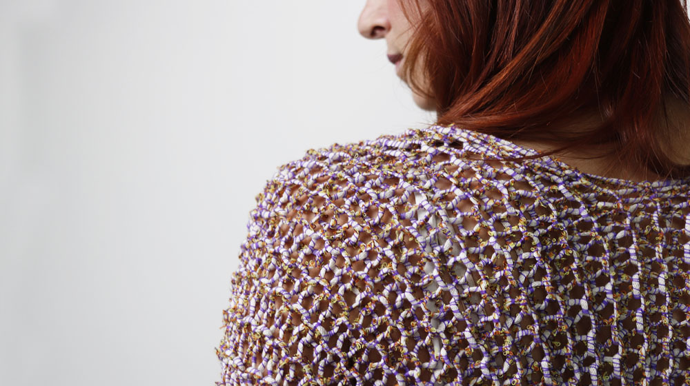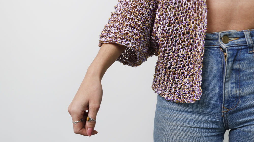 Piegate il lavoro a metà in corrispondenza della breve apertura per lo scollo, poi chiudete i sottomanica e i fianchi.