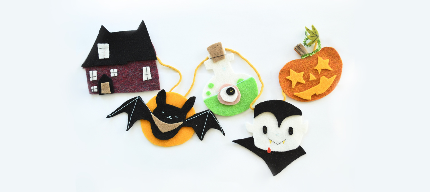 Con questo tutorial realizzeremo un festone di Halloween in feltro con 5 soggetti a tema. Una casa infestata dai fantasmi, un pipistrello, una pozione stregata, un vampiro e una zucca.