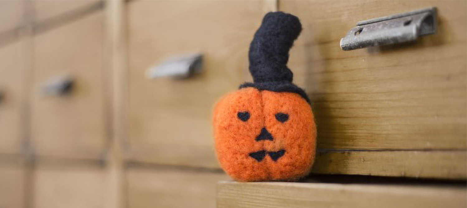 Per realizzare l’espressione della zucca (occhi naso e denti) utilizzare pezzi piccolissimi di lana (oppure triangolini di prefeltro) da punciare direttamente sulla zucca con l’ago fine.
