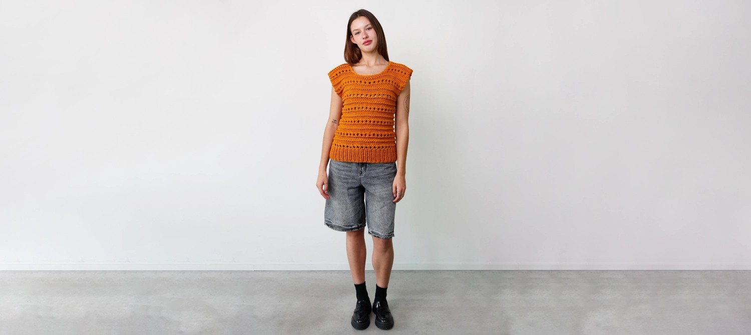 Сегодня мы свяжем топ с ажурной полосой. Этот приём не только создаёт красивый «арабеск» по всему топу, но и особенно хорошо смотрится с чуть более толстой пряжей, которая помогает лучше выделить рисунок. Именно поэтому для модели выбрана лента из 100% хлопка Stromboli, очень объёмная и плотная. В результате получается идеальное сочетание.