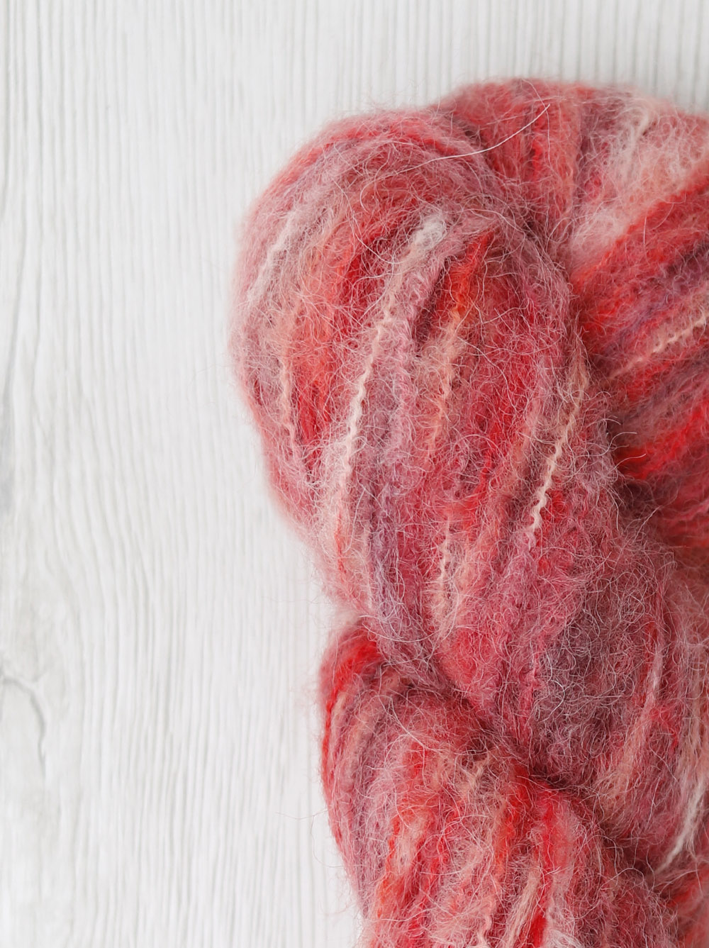 Cumbria è un filato di alpaca realizzato da tre fili ritorti insieme. 2 capi sottilissimi ne compongono l’anima nella quale si inserisce un terzo filo, super sottile, peloso e impalpabile ma allo stesso tempo voluminoso come una nuvola di zucchero filato. Questo terzo filato di alpaca determina lo spessore variabile dell’intero filato, a seconda della concentrazione o meno della presenza della parte pelosa.