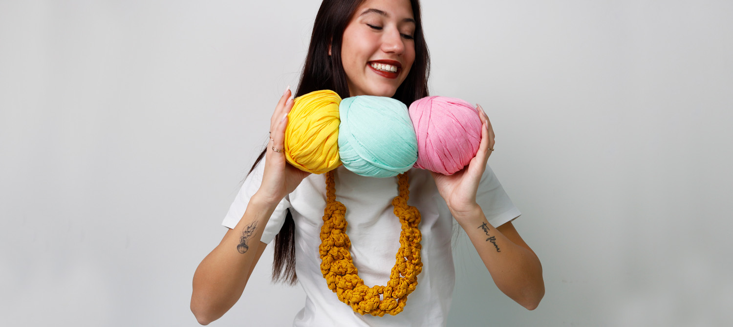 Progetto perfetto anche per principianti! Per questa collana con la fettuccia Stromboli prima si lavora una spighetta rumena di circa 270 cm e poi si continua il lavoro a uncinetto con le dita. Un carinissimo gioiello tessile da sfoggiare sia in estate che in inverno, da realizzare magari in diversi colori per abbinarlo all'outfit del momento. A noi ricorda tanto lo stile intramontabile e giocoso di Marta Marzotto.