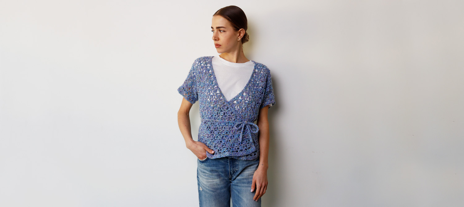 Il top incrociato č formato da 5 pezzi: il dietro e i davanti lavorati in piano, le maniche lavorate in tondo attorno agli scalfi. Tutti i bordi sono lavorati successivamente. La spiegazione che segue č data solo per la taglia M: per le taglie S e L segue una spiegazione sintetica per adattare catenelle di avvio, righe totali e diminuzioni per scollo e spalle.