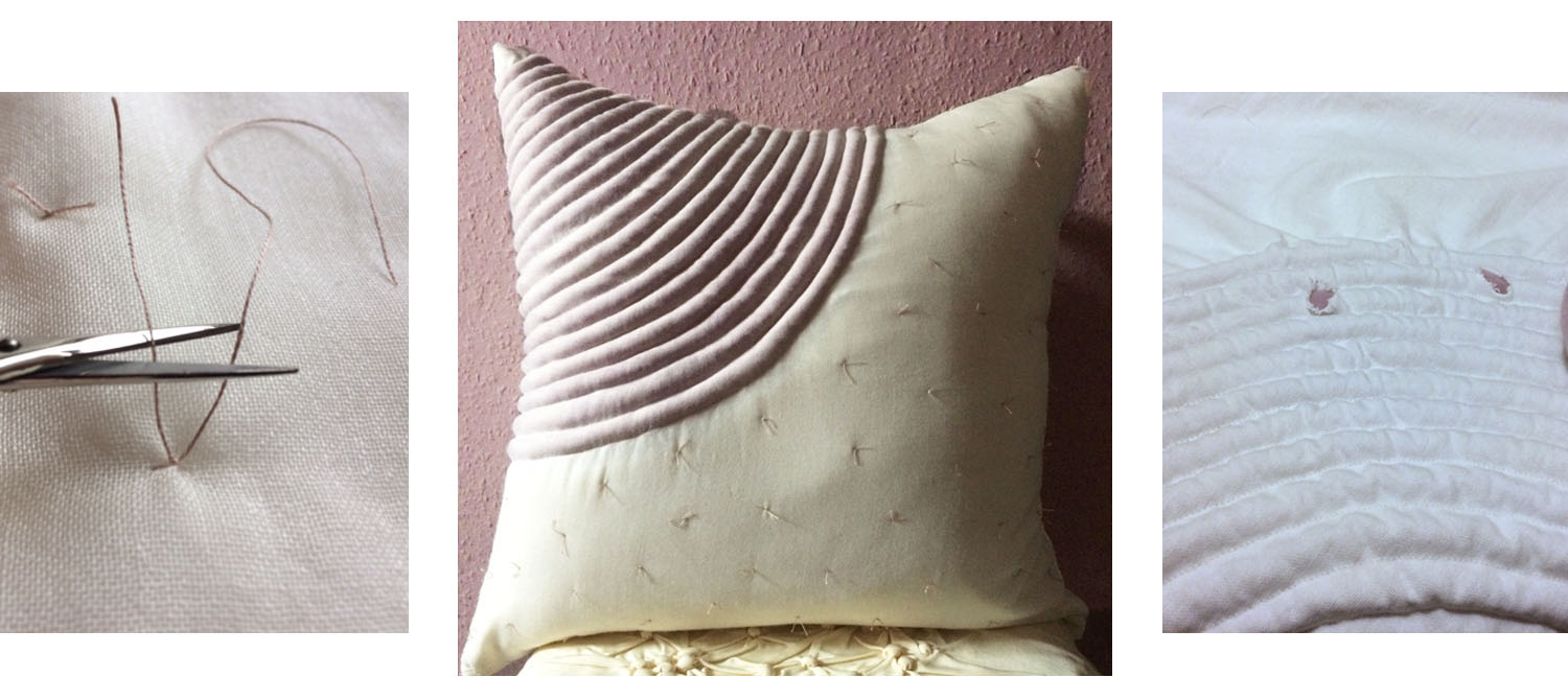 Per realizzare i punti della trapuntatura usate un filo da ricamo, cucendo a punto annodato come mostrato nelle immagini; quindi tagliate i fili troppo lunghi.