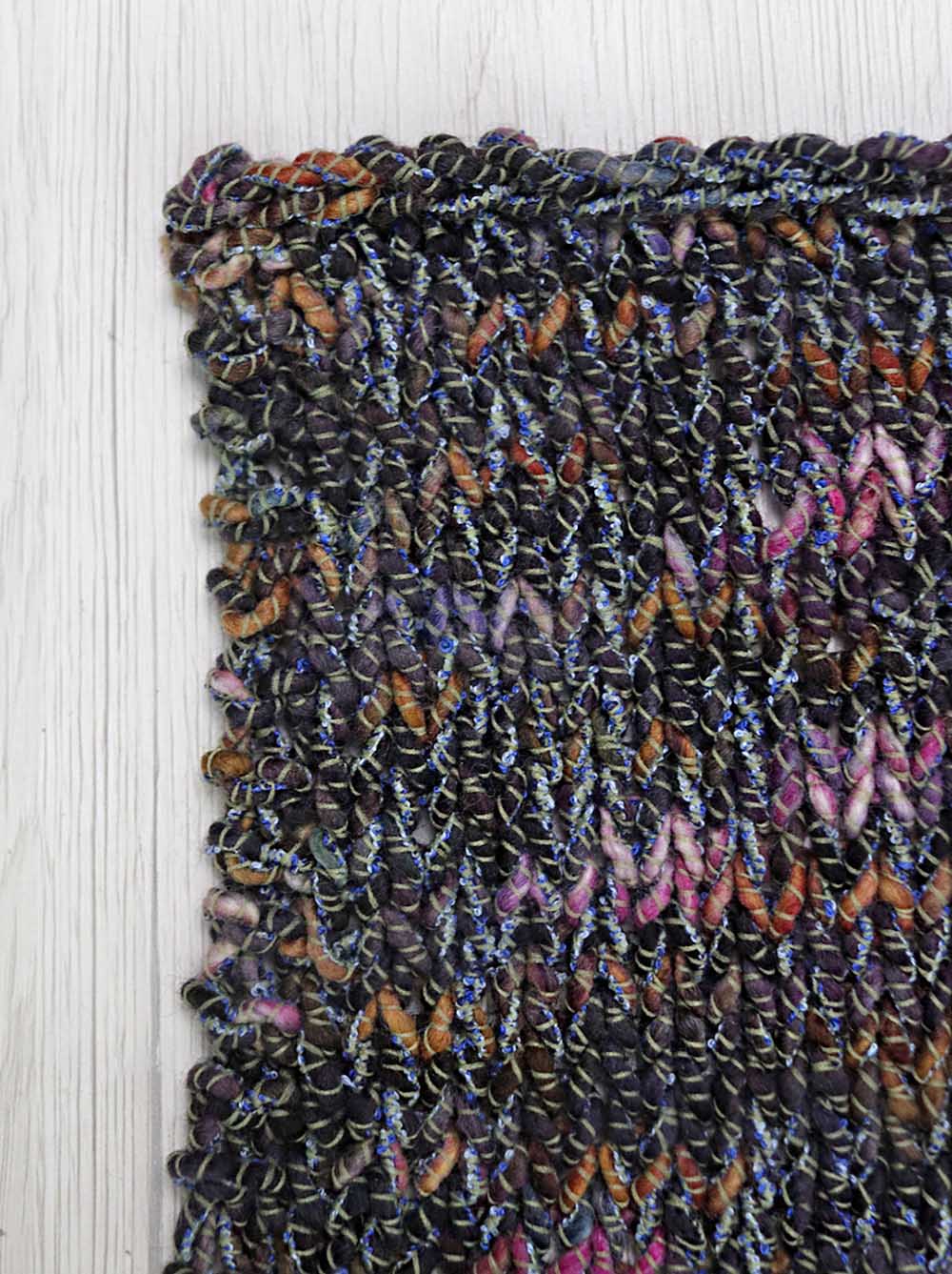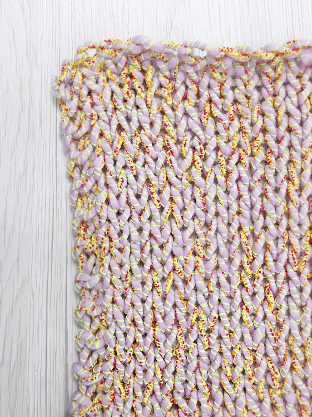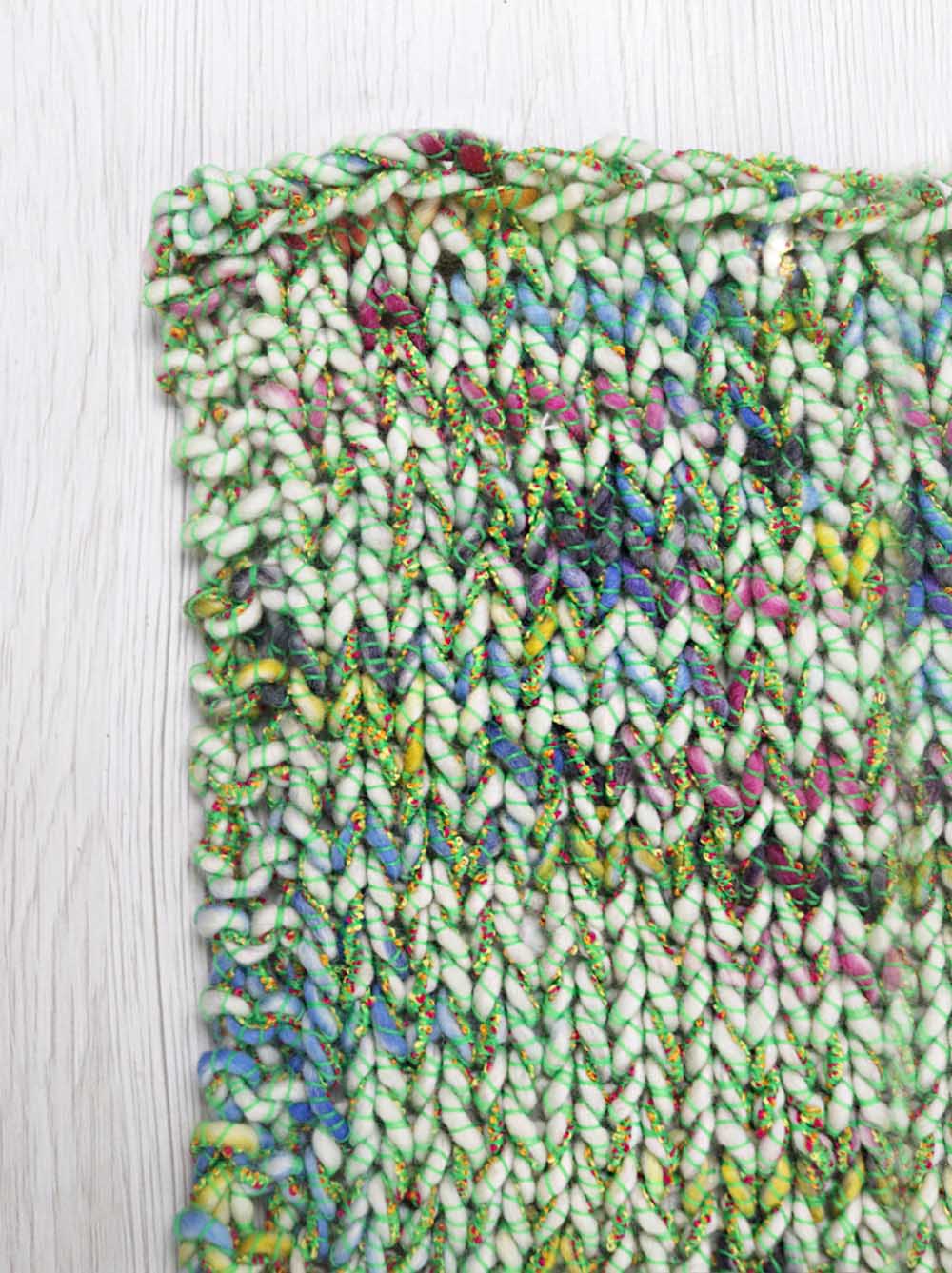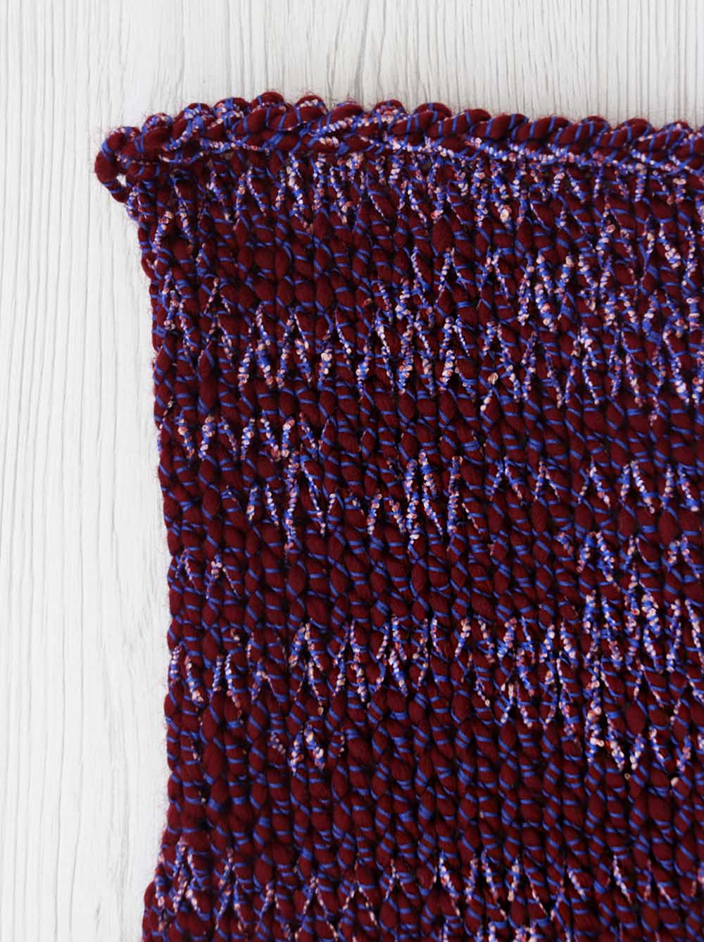 Con il telaio: abbiamo lavorato il filato con telaio a pettine-liccio pettine 20:10 (2 fili/cm). Marni è piuttosto elastico ma facile da tessere. Grazie alla sua particolare struttura anche un progetto molto semplice risulta di grande effetto e molto decorativo, quasi uno stile tweed Chanel. La mano è secca ma piacevole. Prefetto per capispalla e borse, pochette e in generale per tutti quei progetti che hanno bisogno di un filato sostenuto.