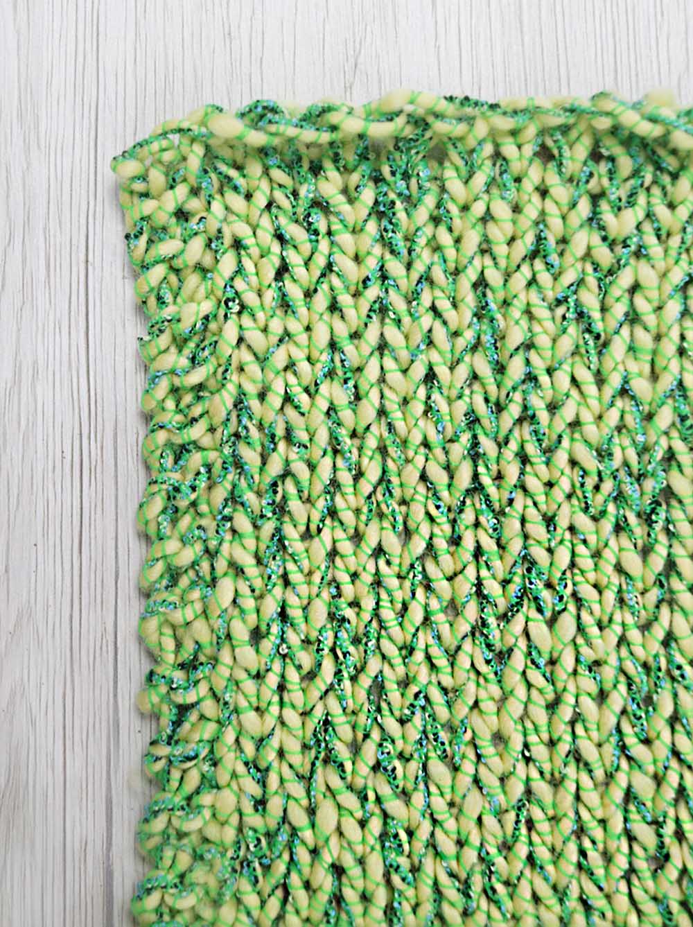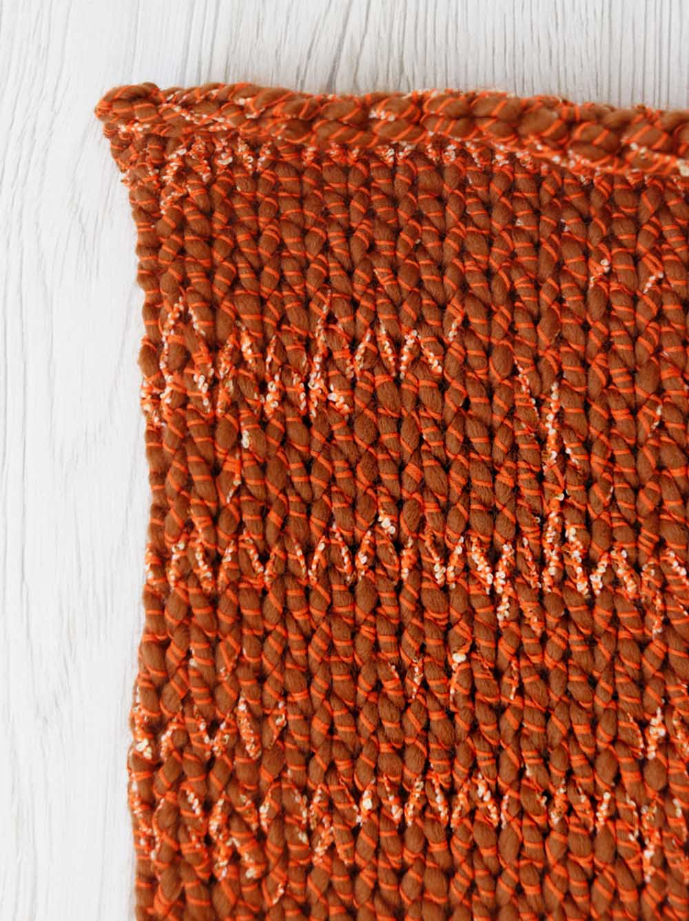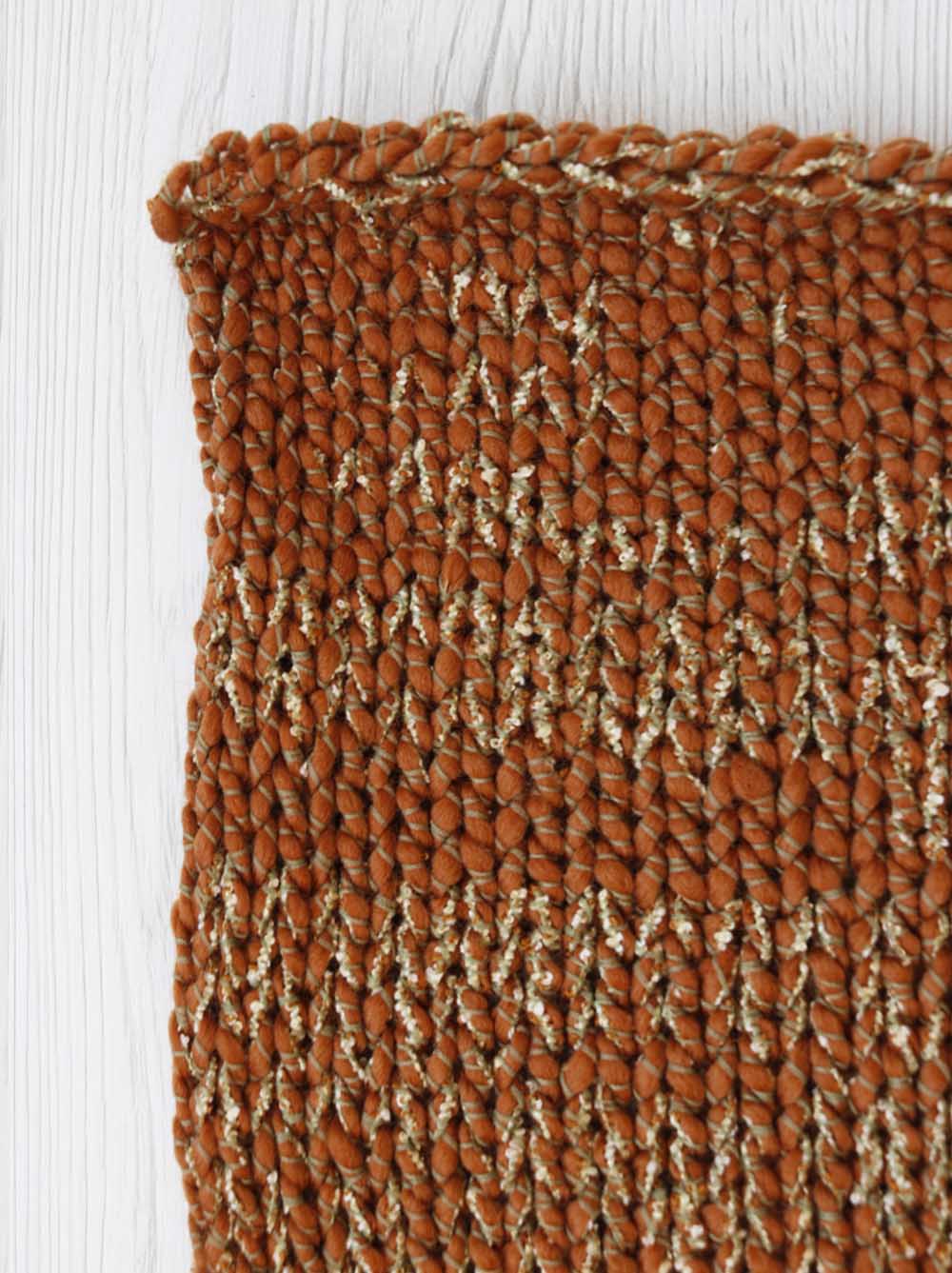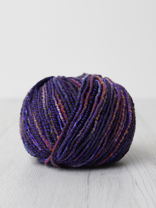 Con il telaio: abbiamo lavorato il filato con telaio a pettine-liccio pettine 20:10 (2 fili/cm). Marni è piuttosto elastico ma facile da tessere. Grazie alla sua particolare struttura anche un progetto molto semplice risulta di grande effetto e molto decorativo, quasi uno stile tweed Chanel. La mano è secca ma piacevole. Prefetto per capispalla e borse, pochette e in generale per tutti quei progetti che hanno bisogno di un filato sostenuto.