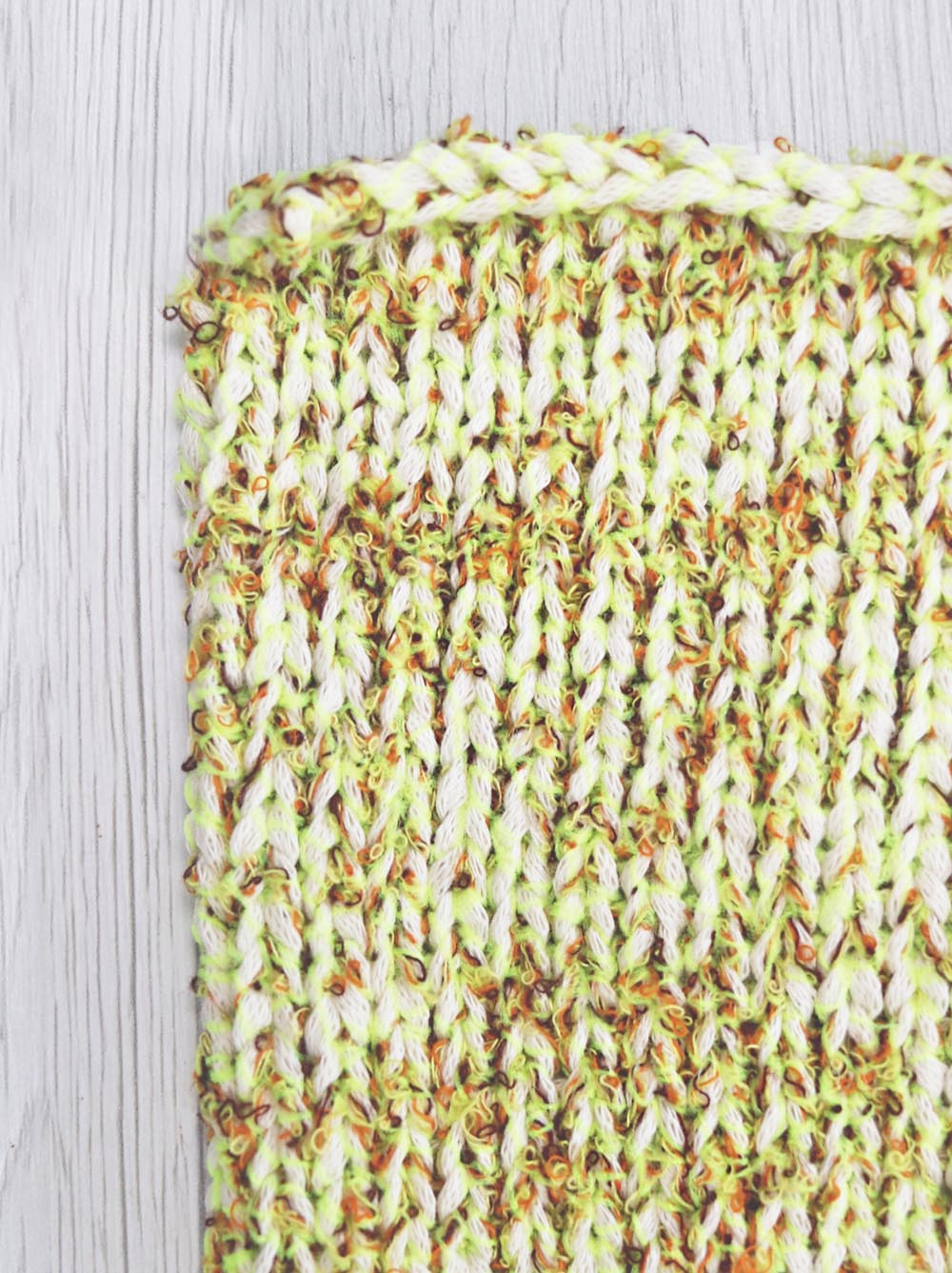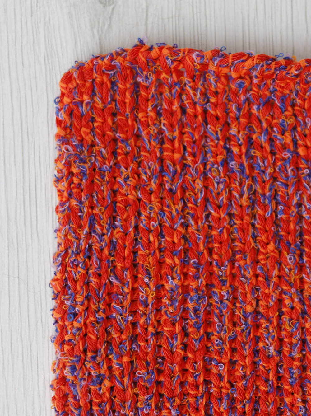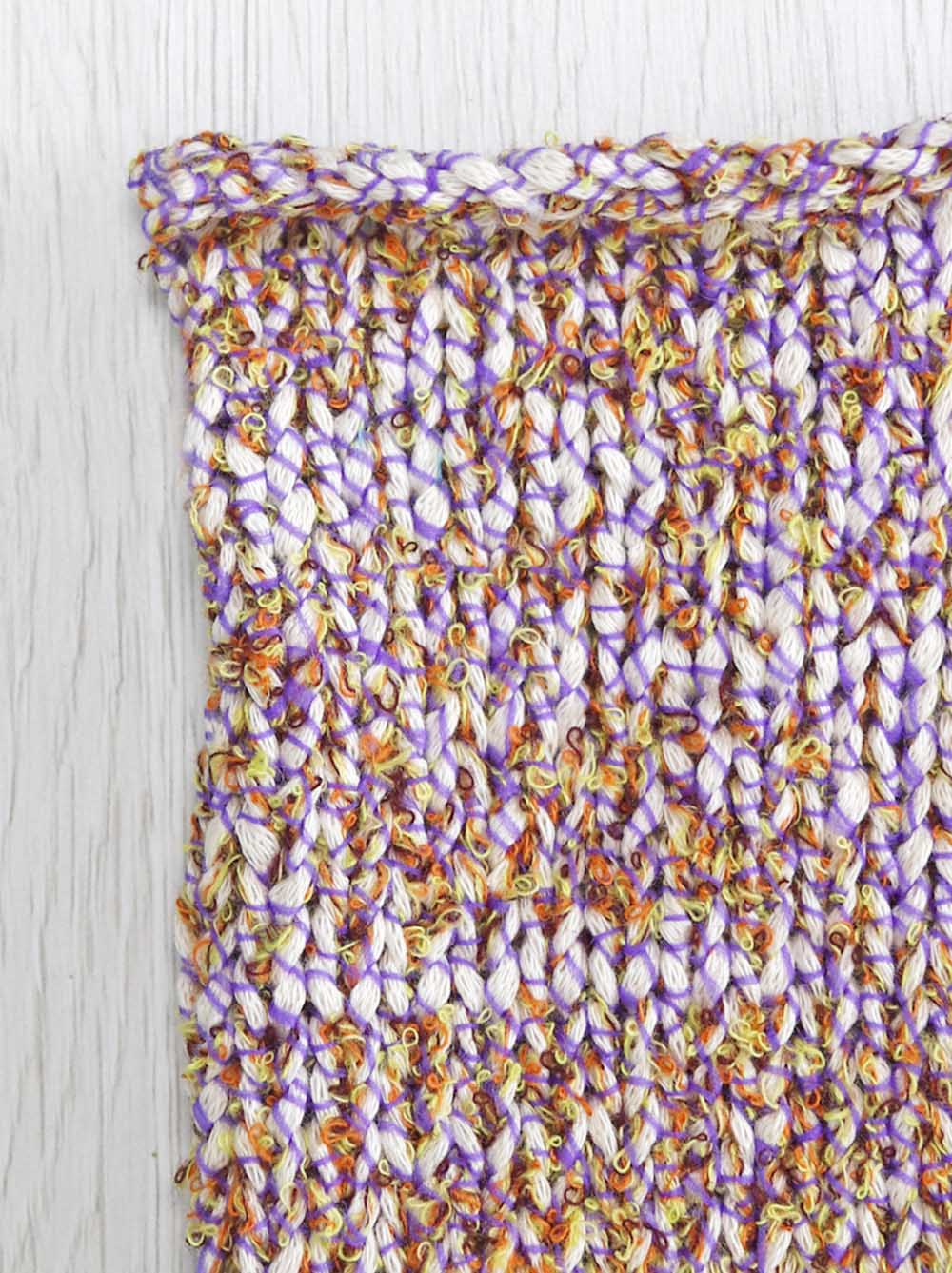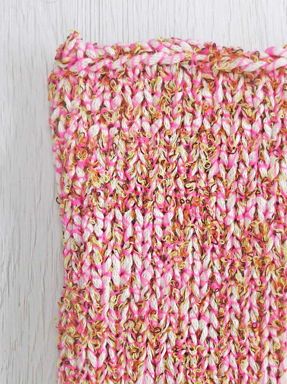 Con il telaio: abbiamo lavorato il filato con telaio a pettine-liccio pettine 32:10 (3,2 fili/cm). Pop non è un filato che nasce per la tessitura ma pensiamo valga sempre la pena sperimentare se si accetta qualche limite e ci divertono le nuove sfide. I risultati, inattesi, potrebbero anche stupire. Da usare preferibilmente in trama e laddove possibile combinato con altri filati. Attenzione: durante la lavorazione il filato ritorto sulla fettuccia di cotone tende a slittare e ad addensarsi. Crea così effetti non ripetibili e controllabili ma il risultato estetico a noi piace da morire. È quasi un tweed pop!