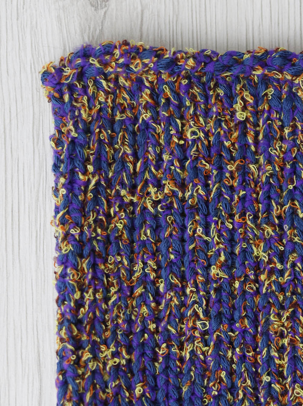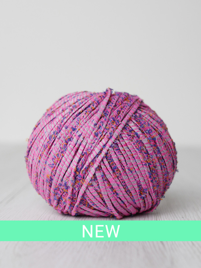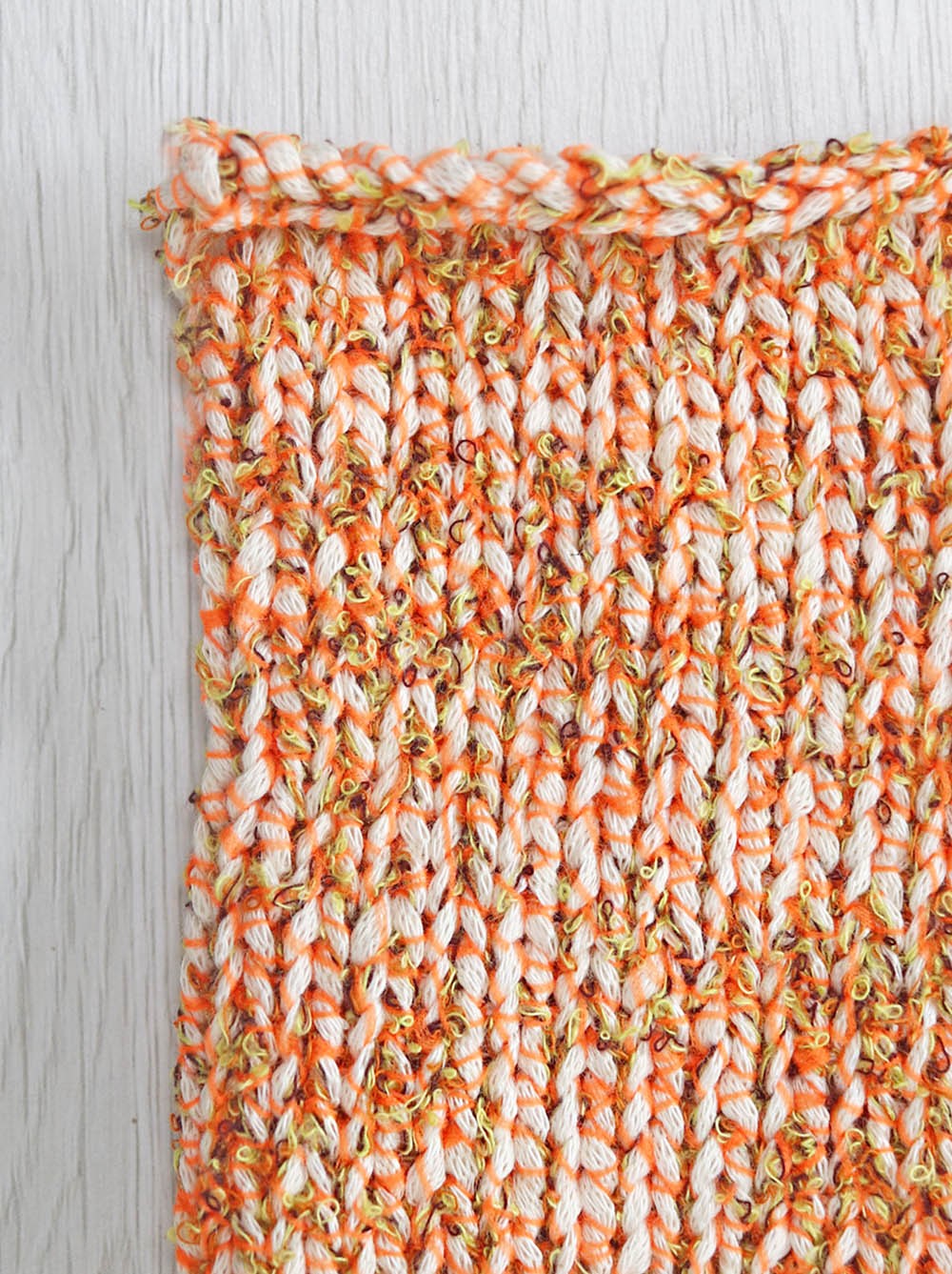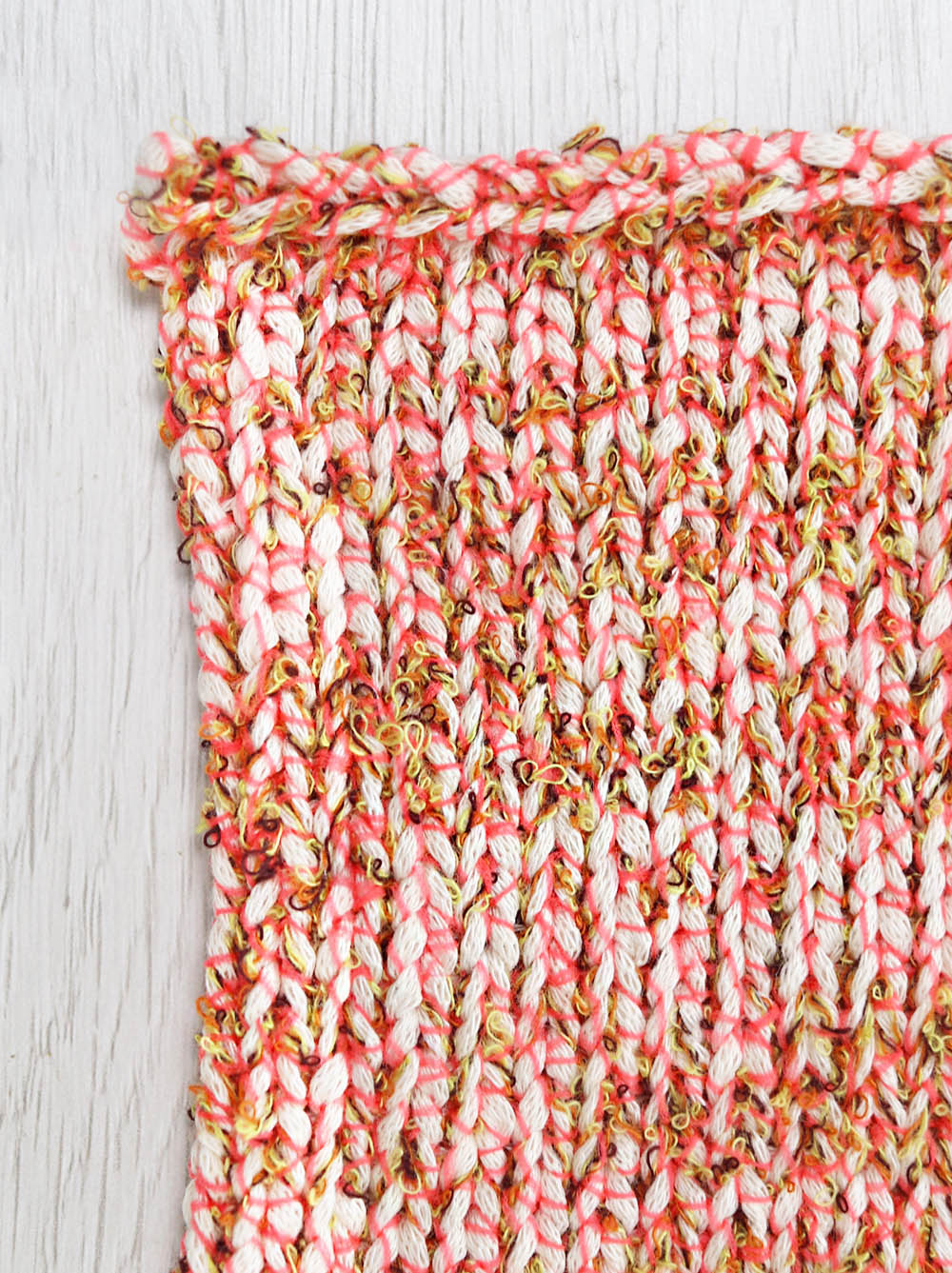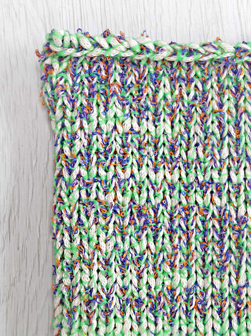 Con il telaio: abbiamo lavorato il filato con telaio a pettine-liccio pettine 32:10 (3,2 fili/cm). Pop non è un filato che nasce per la tessitura ma pensiamo valga sempre la pena sperimentare se si accetta qualche limite e ci divertono le nuove sfide. I risultati, inattesi, potrebbero anche stupire. Da usare preferibilmente in trama e laddove possibile combinato con altri filati. Attenzione: durante la lavorazione il filato ritorto sulla fettuccia di cotone tende a slittare e ad addensarsi. Crea così effetti non ripetibili e controllabili ma il risultato estetico a noi piace da morire. È quasi un tweed pop!