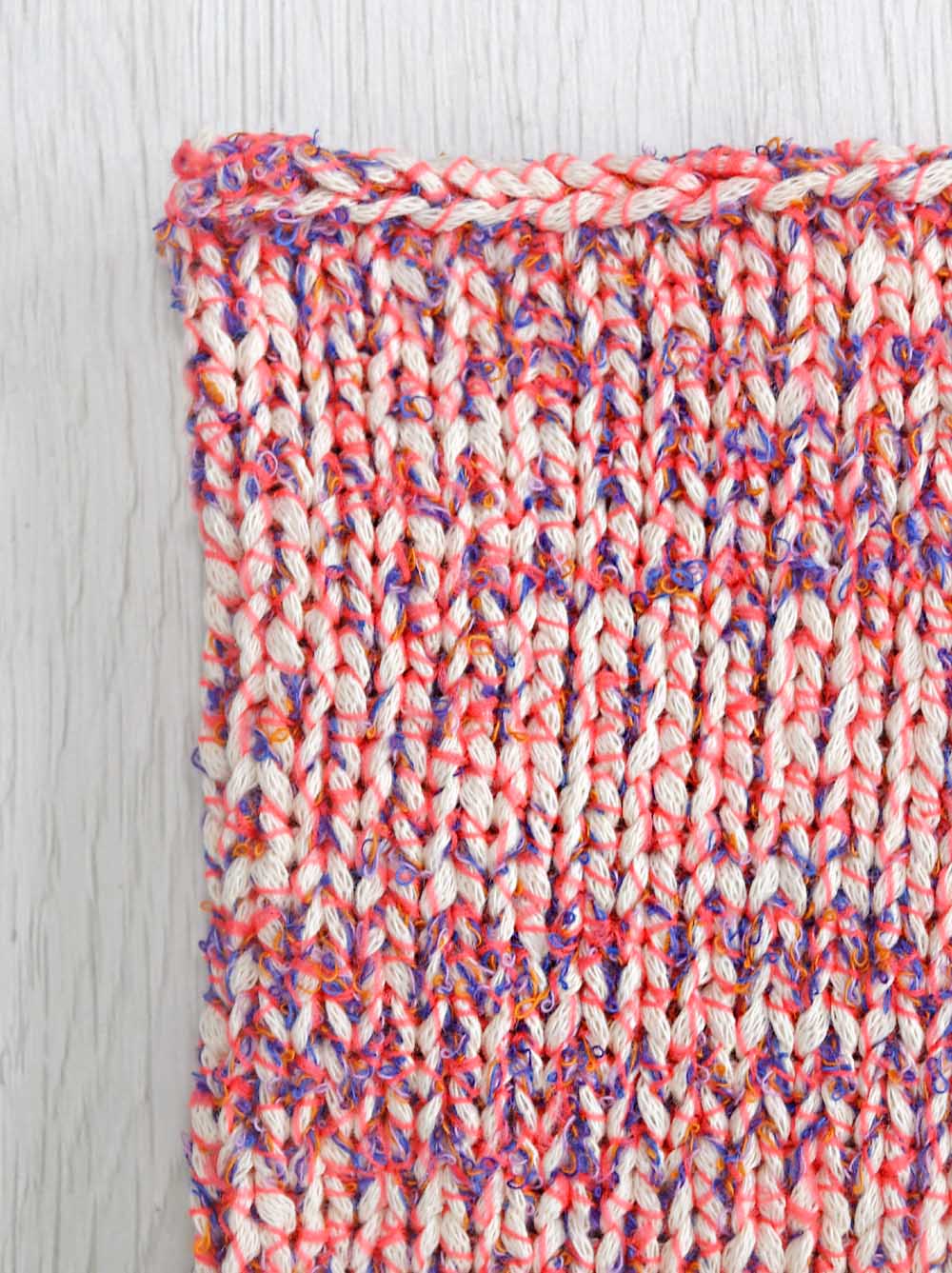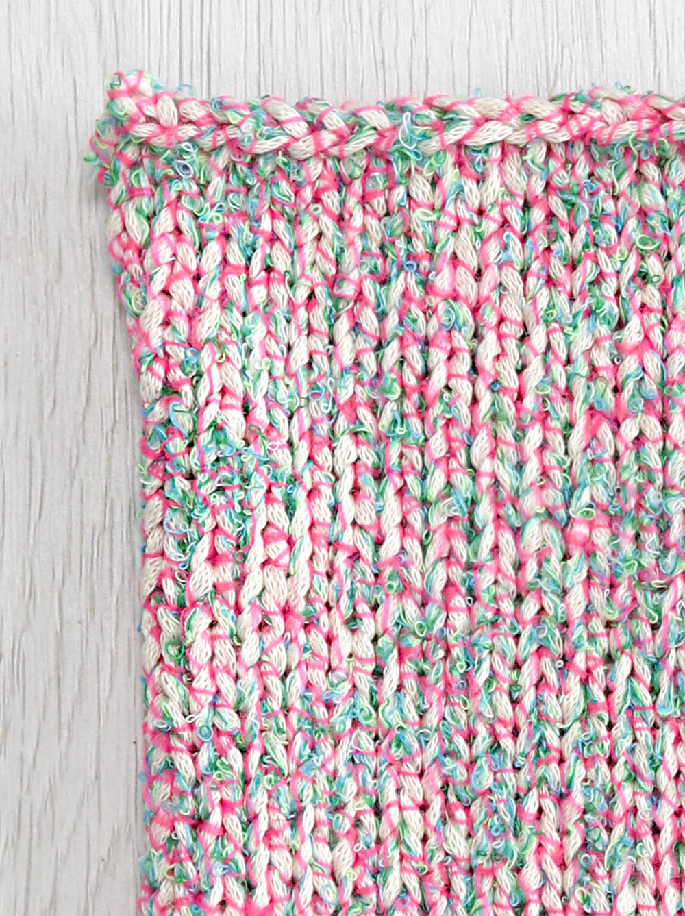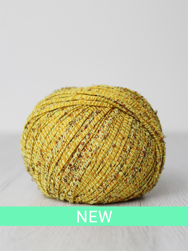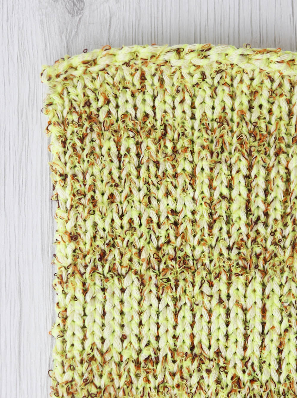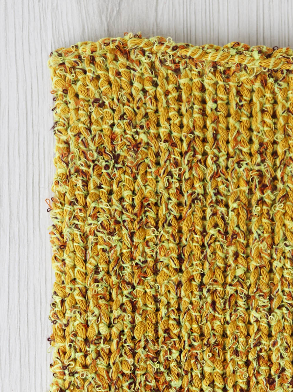 Con il telaio: abbiamo lavorato il filato con telaio a pettine-liccio pettine 32:10 (3,2 fili/cm). Pop non è un filato che nasce per la tessitura ma pensiamo valga sempre la pena sperimentare se si accetta qualche limite e ci divertono le nuove sfide. I risultati, inattesi, potrebbero anche stupire. Da usare preferibilmente in trama e laddove possibile combinato con altri filati. Attenzione: durante la lavorazione il filato ritorto sulla fettuccia di cotone tende a slittare e ad addensarsi. Crea così effetti non ripetibili e controllabili ma il risultato estetico a noi piace da morire. È quasi un tweed pop!