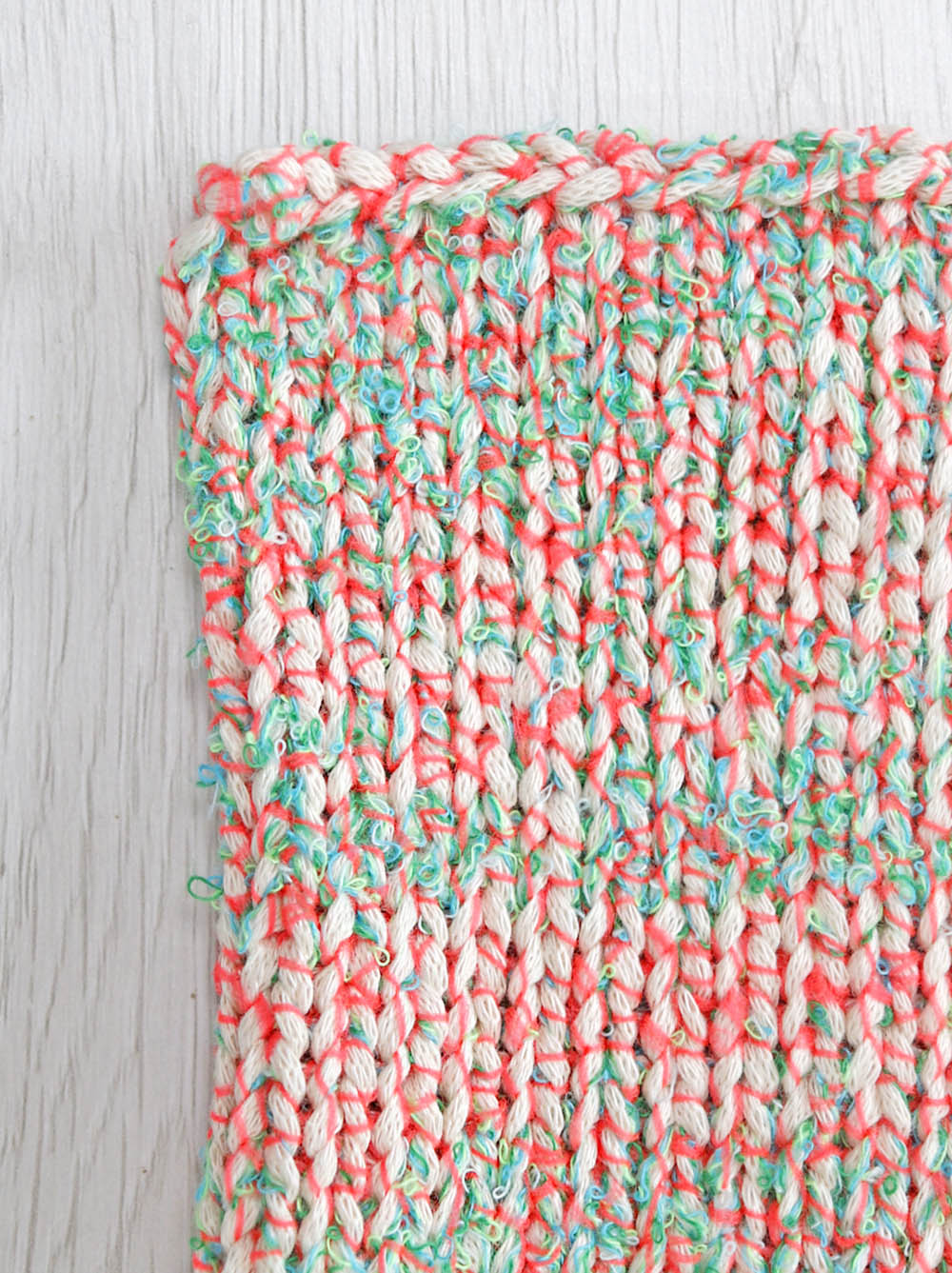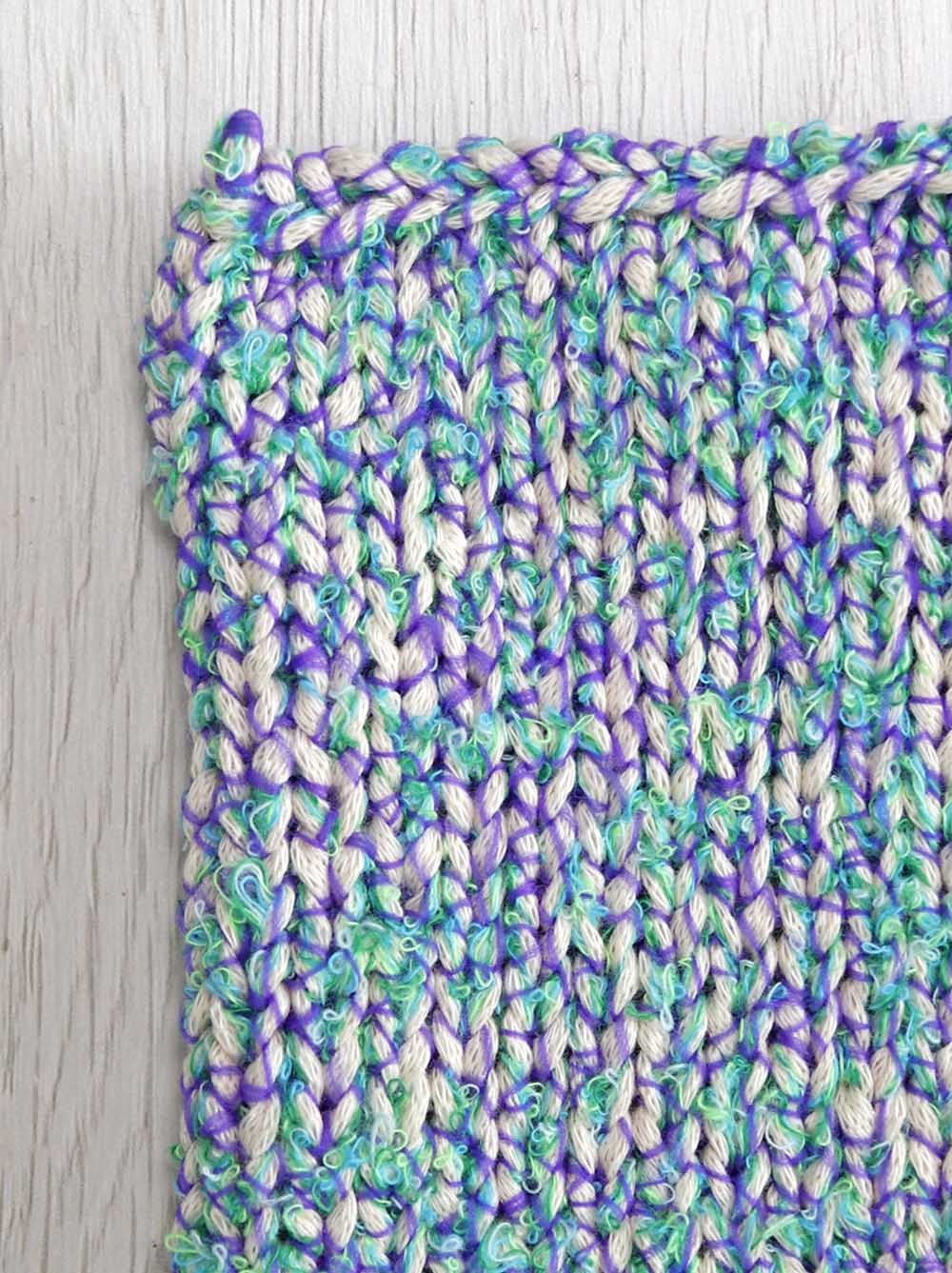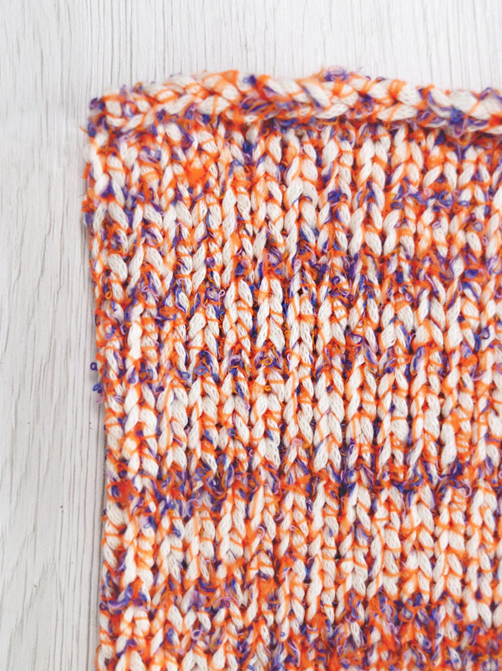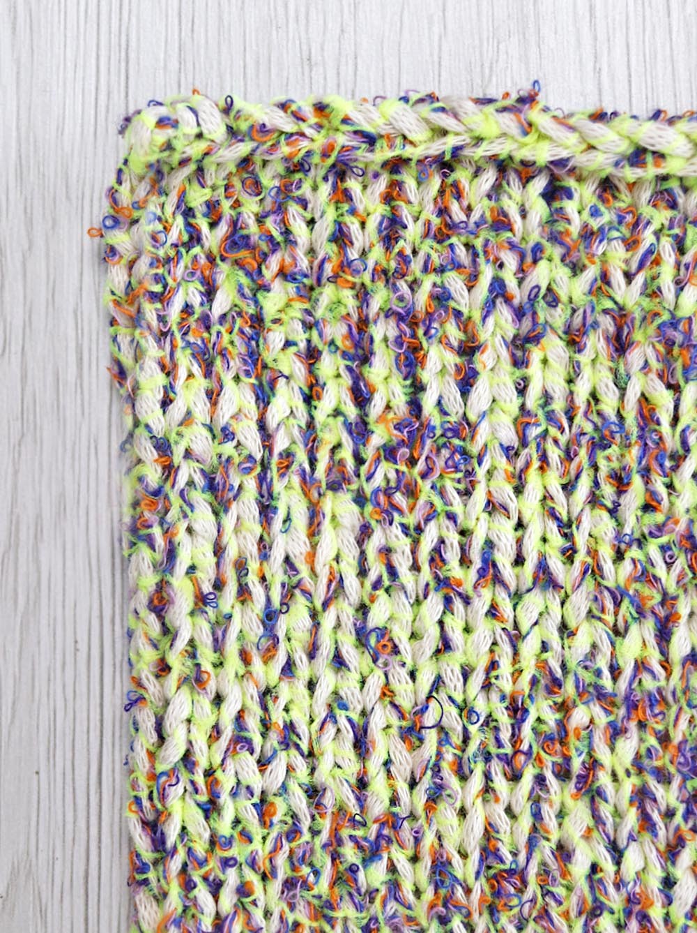 Con il telaio: abbiamo lavorato il filato con telaio a pettine-liccio pettine 32:10 (3,2 fili/cm). Pop non è un filato che nasce per la tessitura ma pensiamo valga sempre la pena sperimentare se si accetta qualche limite e ci divertono le nuove sfide. I risultati, inattesi, potrebbero anche stupire. Da usare preferibilmente in trama e laddove possibile combinato con altri filati. Attenzione: durante la lavorazione il filato ritorto sulla fettuccia di cotone tende a slittare e ad addensarsi. Crea così effetti non ripetibili e controllabili ma il risultato estetico a noi piace da morire. È quasi un tweed pop!
