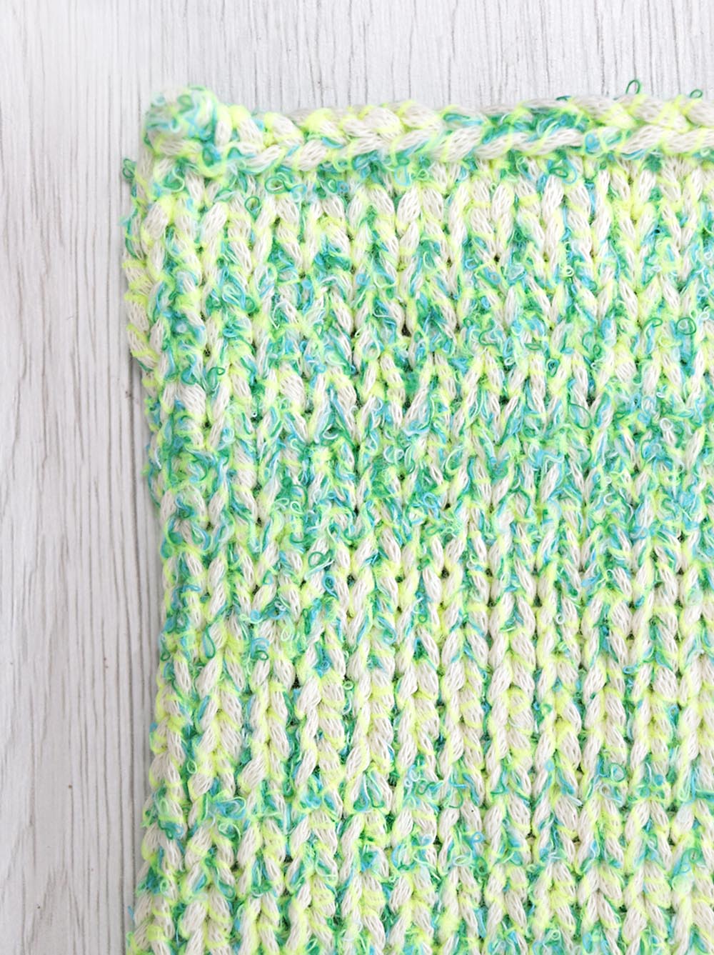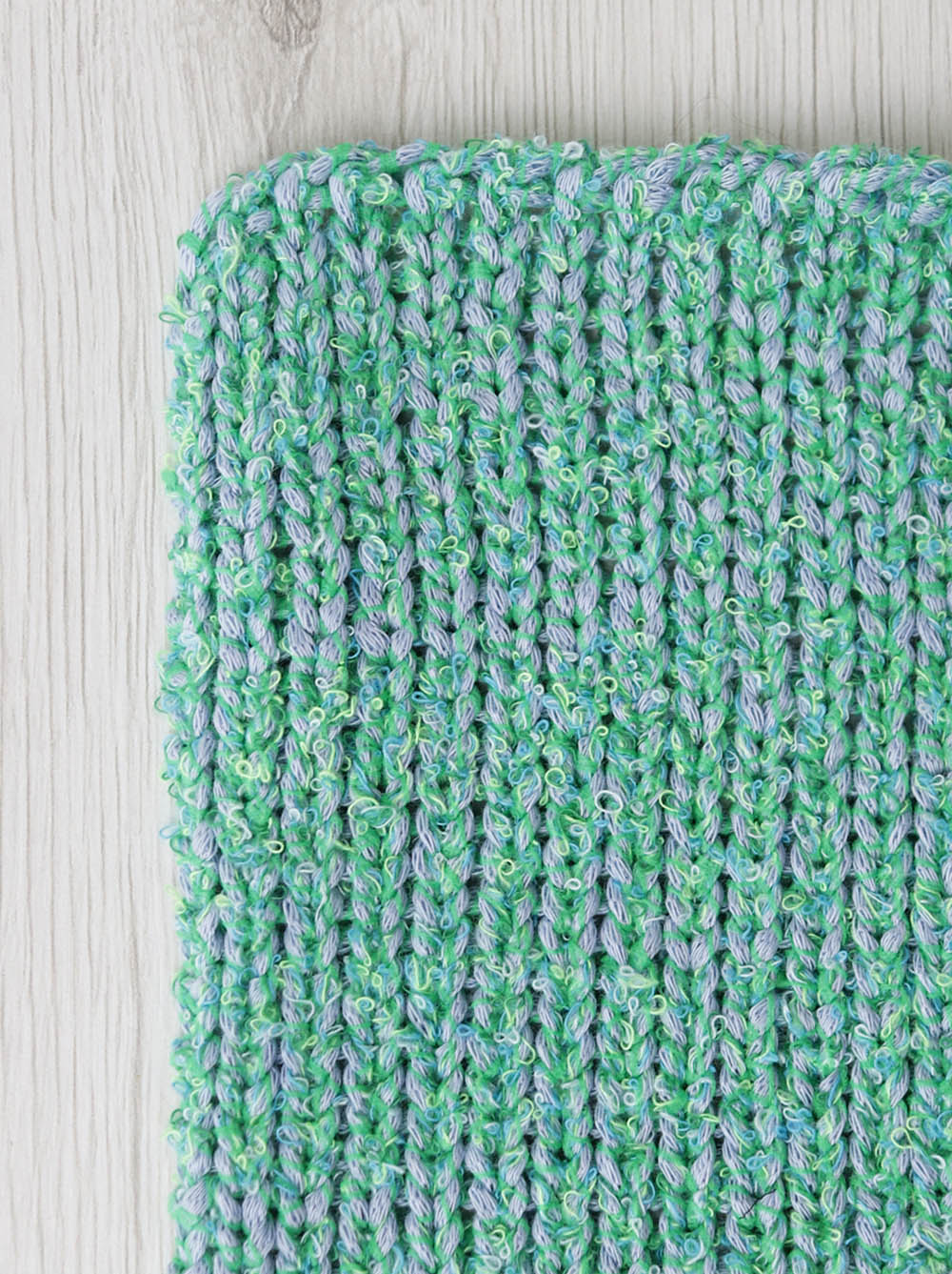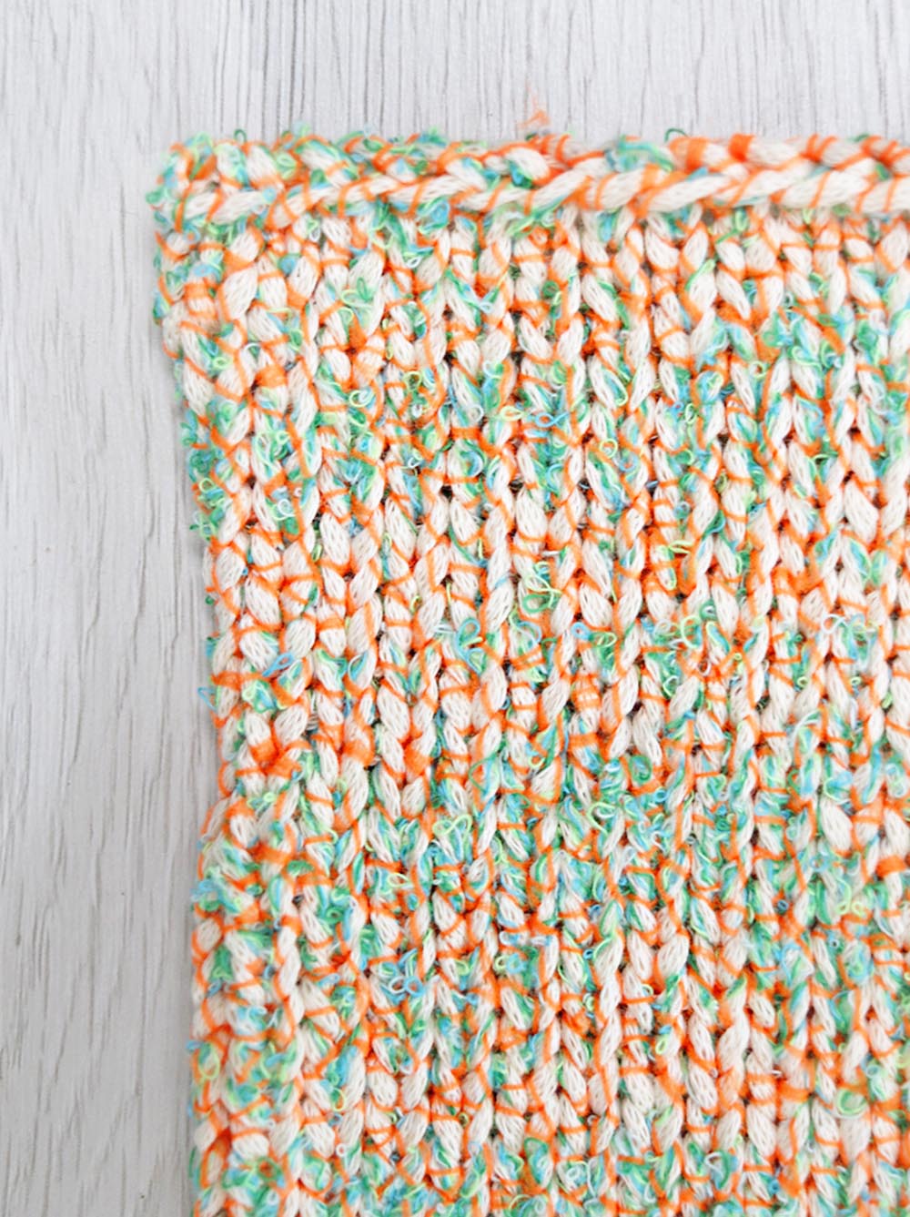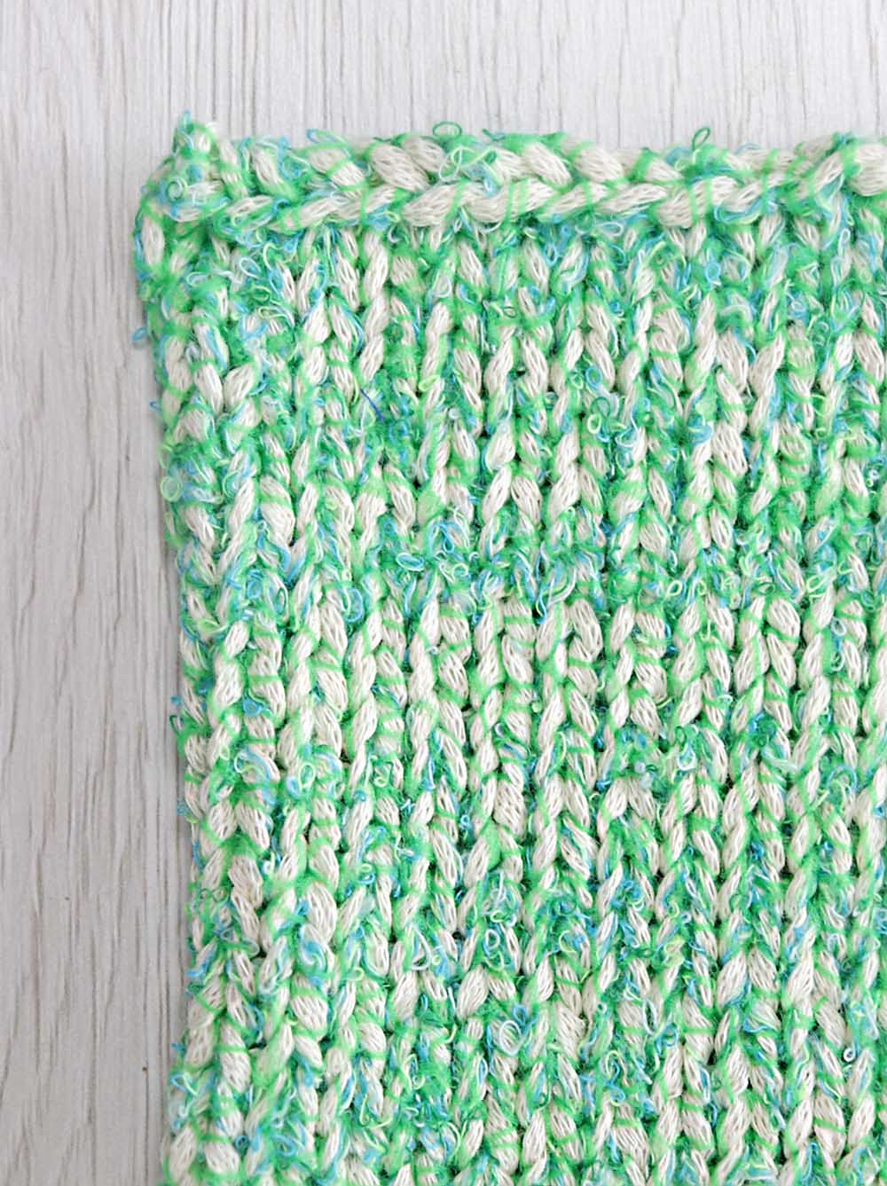 Con il telaio: abbiamo lavorato il filato con telaio a pettine-liccio pettine 32:10 (3,2 fili/cm). Pop non è un filato che nasce per la tessitura ma pensiamo valga sempre la pena sperimentare se si accetta qualche limite e ci divertono le nuove sfide. I risultati, inattesi, potrebbero anche stupire. Da usare preferibilmente in trama e laddove possibile combinato con altri filati. Attenzione: durante la lavorazione il filato ritorto sulla fettuccia di cotone tende a slittare e ad addensarsi. Crea così effetti non ripetibili e controllabili ma il risultato estetico a noi piace da morire. È quasi un tweed pop!