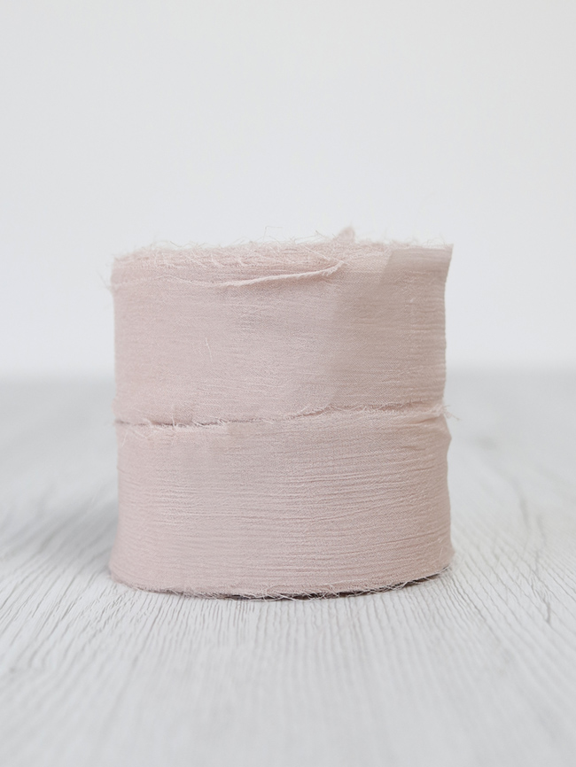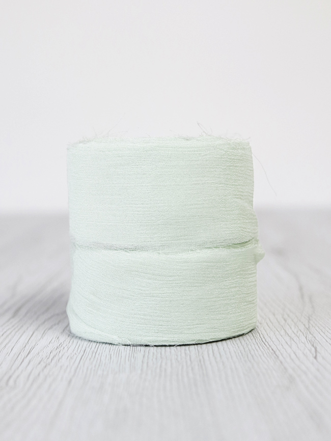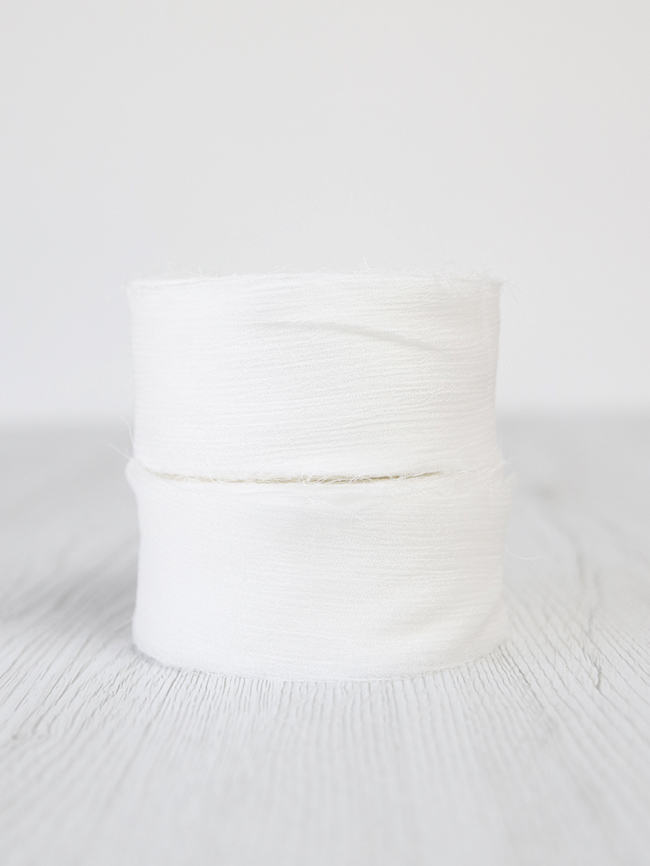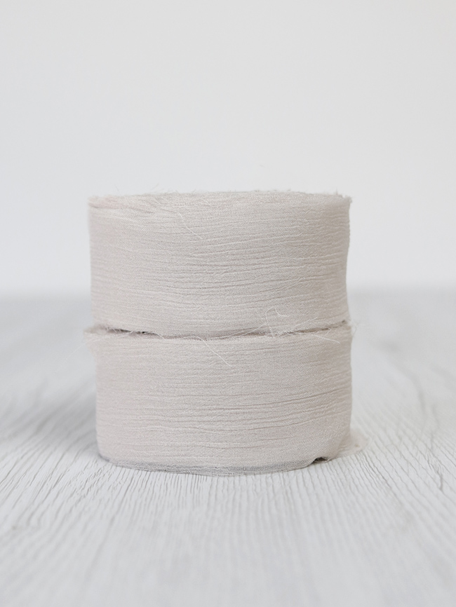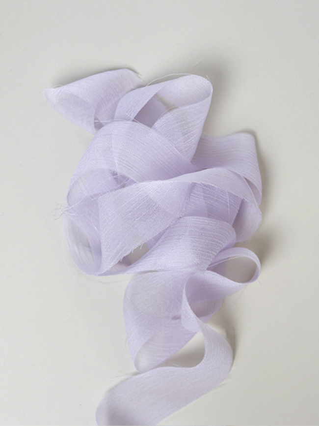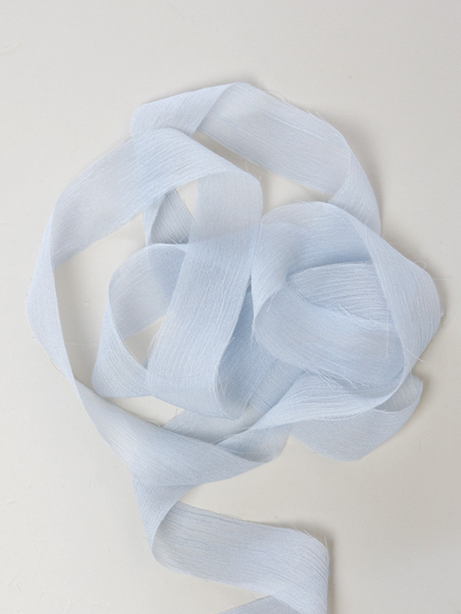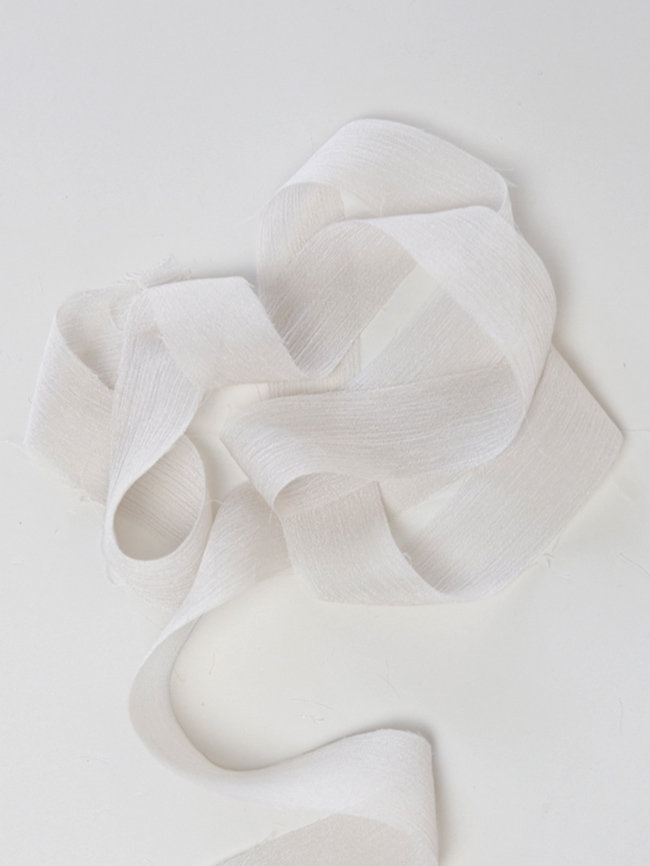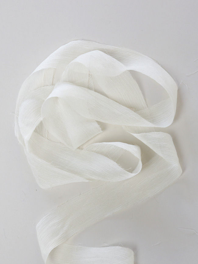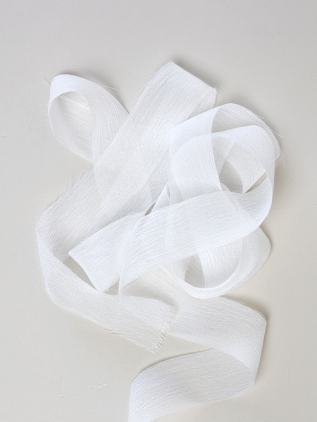 La superficie è caratterizzata da lievi increspature che donano tridimensionalità e matericità, i bordi sono a taglio vivo leggermente sprefilati. Il nastro di crinkle chiffon DHG è quindi un prodotto che combina due anime: una più elegante e una più casual. È per questo che diventa davvero camaleontico e adatto a tantissime occasioni diverse.