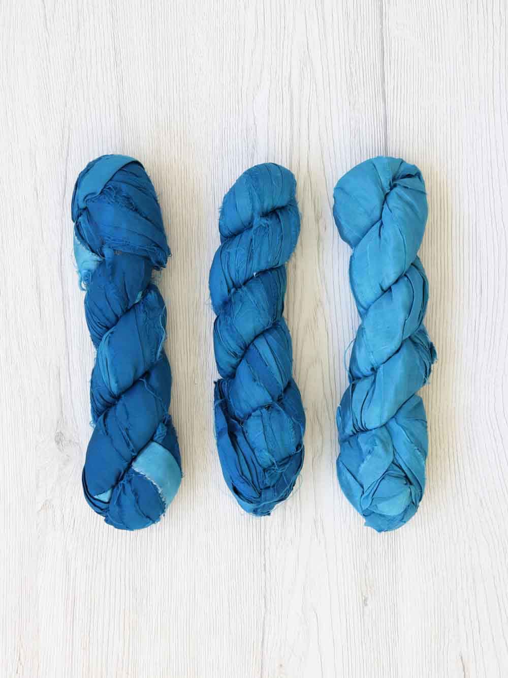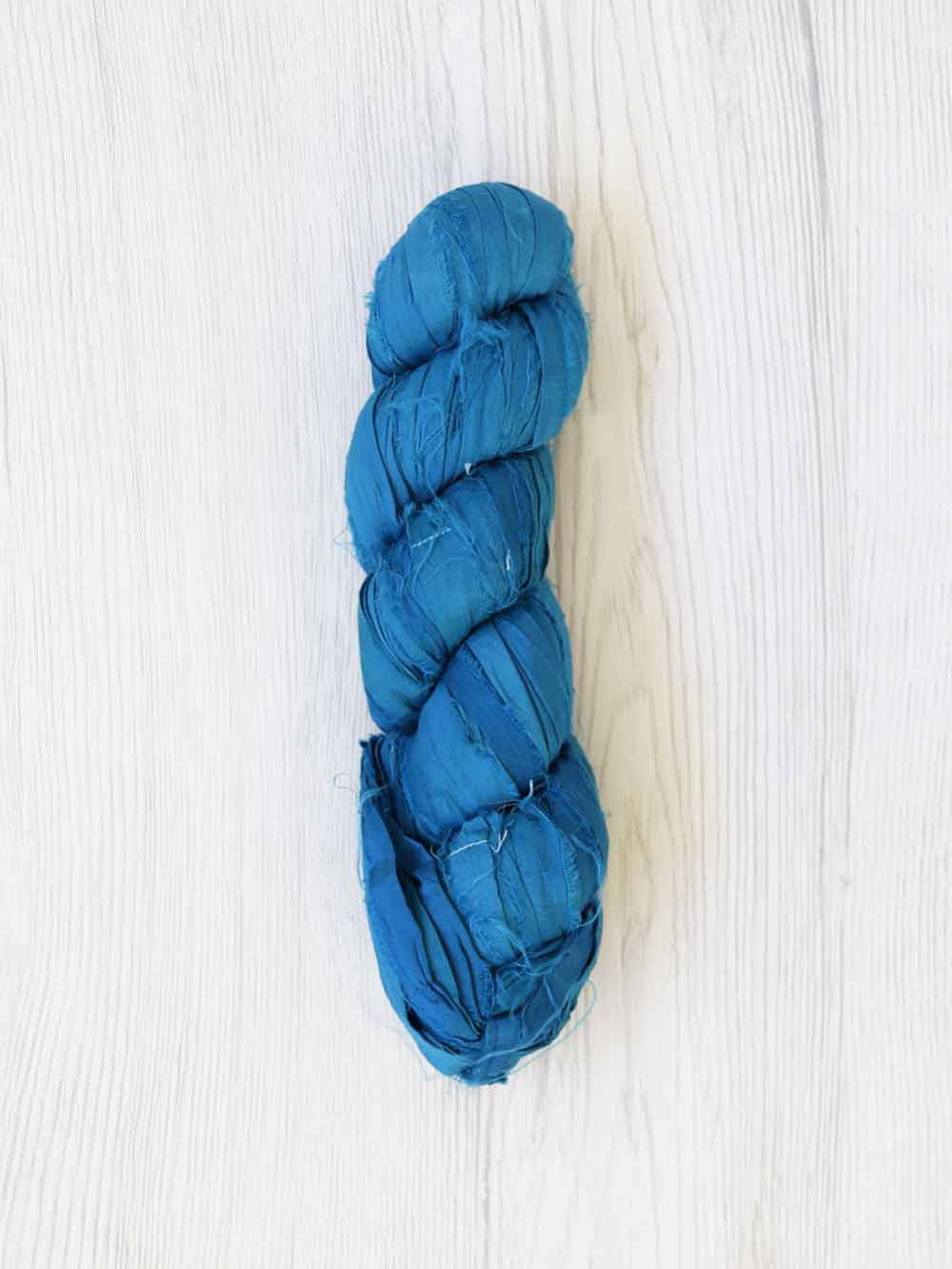 bordi sono “a taglio vivo” e sfilacciati e le tinture sono generalmente non omogene (e questo è il bello!) perché il nastro all’interno di una stessa matassa è tendenzialmente realizzato a partire da tessuti Sari di lotti diversi quindi