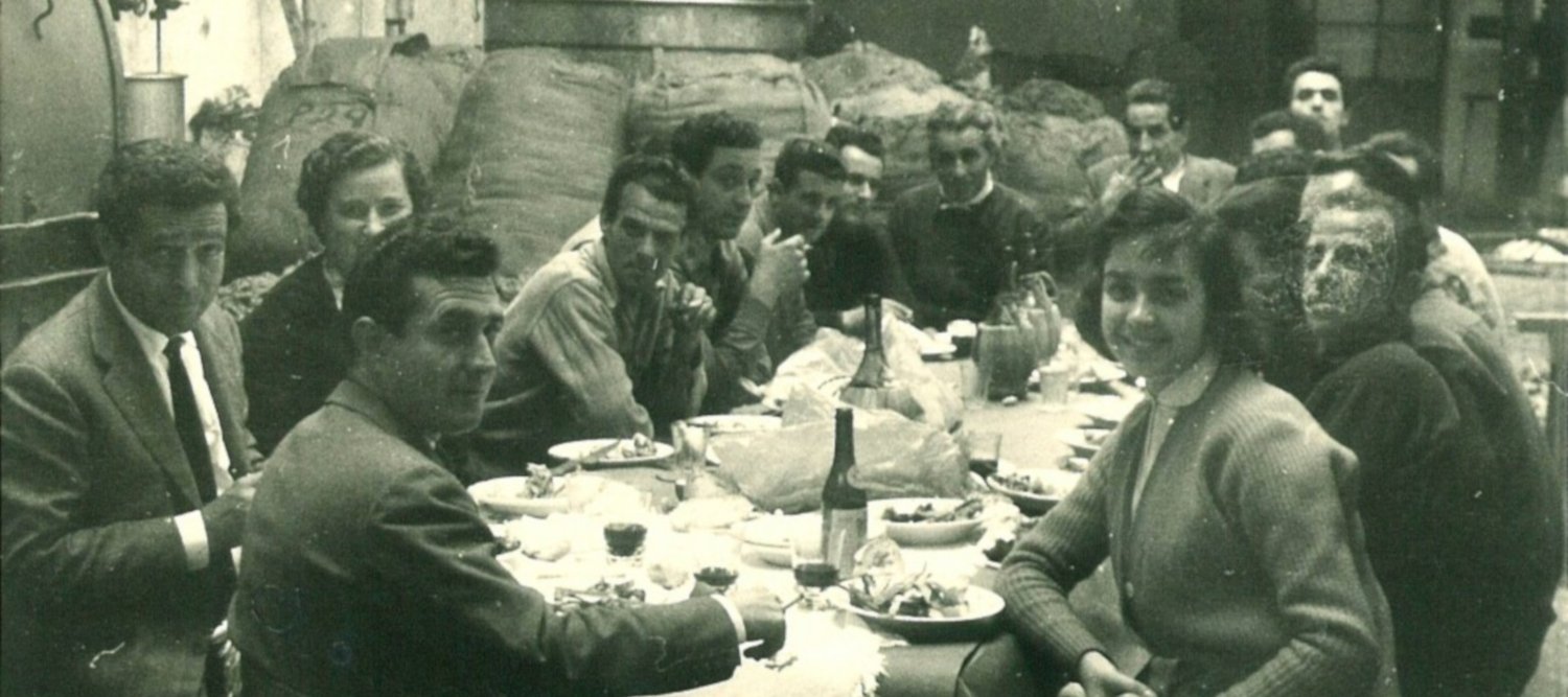 It is a photo taken in the 1950’s inside one of our dyeing houses. The company’s workers are gathered around a table set up among the dye vats and decked out for a holiday. A family dinner, of sorts.