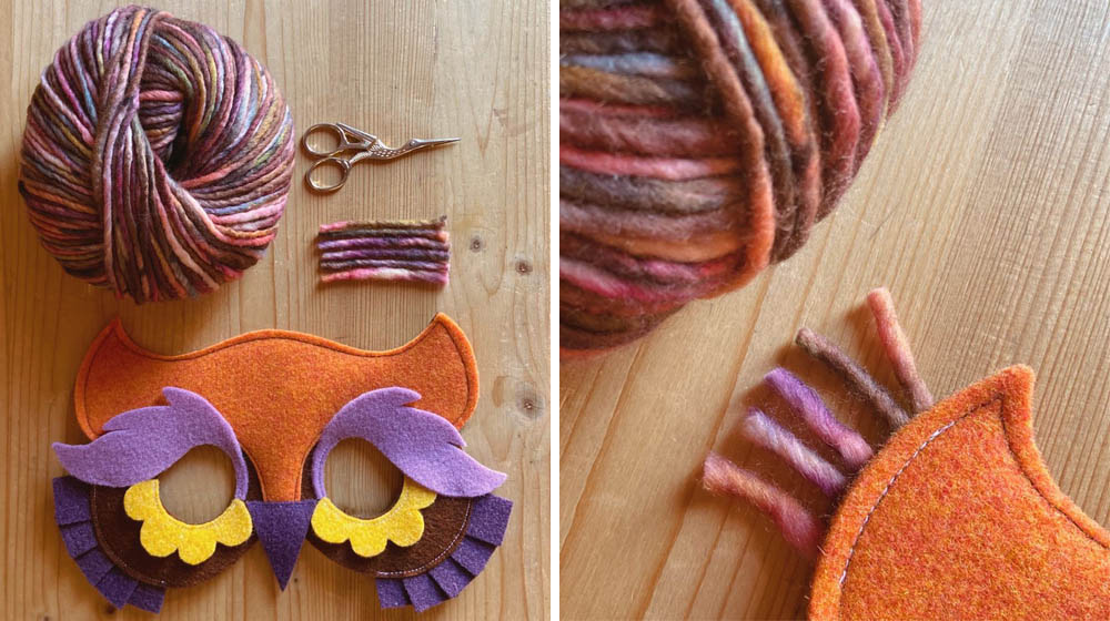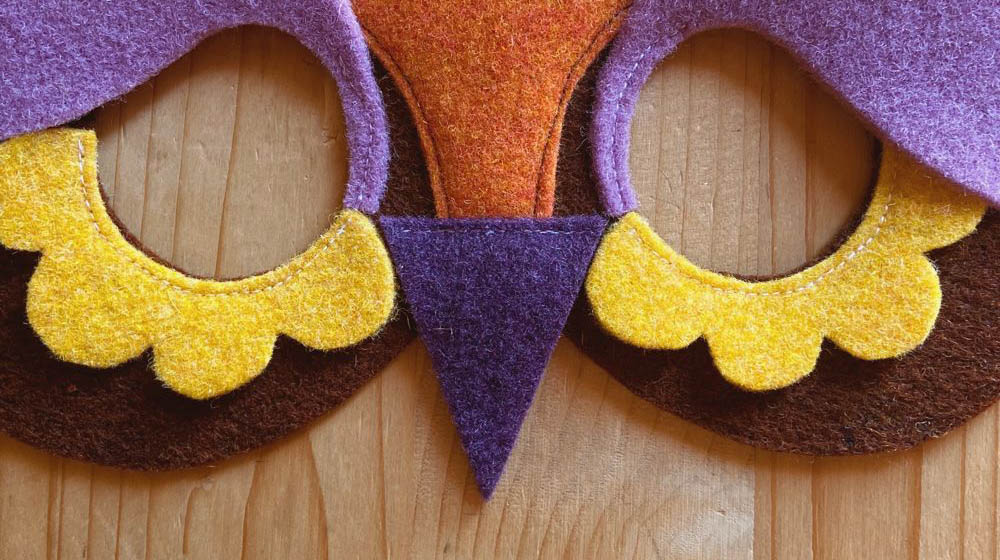 Now move on to decorating the eyes. You’re going to use the felt in the colour Yolk for the bottom lashes and the colour Wisteria for the bushy eyebrows. Just like for the first part you can draw the eyelashes and eyebrows directly onto the felt or use the template to help you. Once you’ve cut out all the pieces put them onto the mask and secure them on with a sewing machine.
