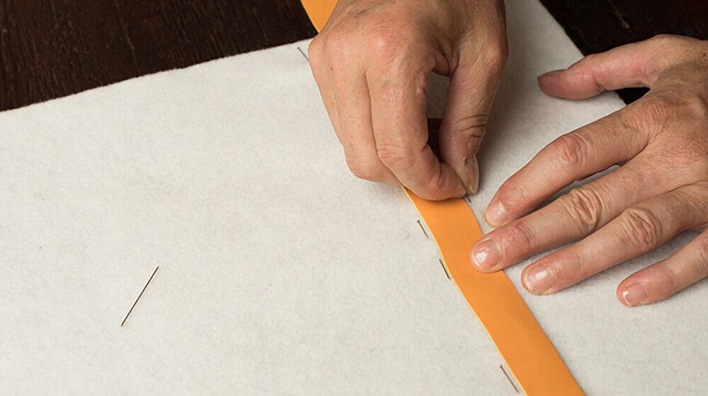 Keeping in mind the measurements that you chose for the felt placemat. Outline and cut the faux leather into stripes of different lengths, but always long enough to go over the edge of the placemat. As you will see, I am going to position them parallel to the shorter side of the felt placemat. So my stripes are between 37 and 40 cm in length. The width of the stripes are also different. I feel that gives the piece more character. Some stripes are 1cm wide, others are 2.5, others are 3cm. On our website you’ll find faux leather ribbons of different widths. So if you want to save some time and be sure to have nicely cut straight stripes, you can just go ahead and buy the different sizes to alternate.