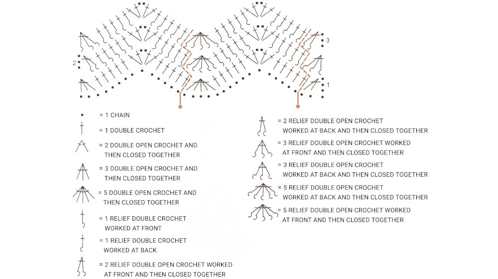 row 2: chain 3, 2 relief double open crochet worked at back and then closed together (=around each of the following 2 stitches work 1 relief double crochet worked at back then close them together), + 1 relief double crochet worked at front around each of the 5 following stitches, in the arch work: 2 double crochets, chain 2 and 2 double crochets; 1 relief double crochet worked at front around each of the following 5 stitches +, * 5 relief double open crochet worked at back and then close them together (= around each of the 5 following stitches work 1 relief double open crochet and then close them together), work from + to + *, finish off with 3 relief double open crochet worked at back and then closed together (=around each of the last 3 stitches work 1 relief double open crochet worked at back and then close them together)