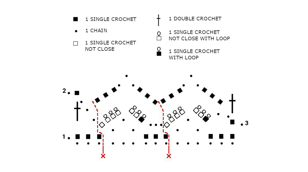 2nd round: chain 1 (it doesn’t replace the initial single crochet) single crochet 1 into the 1st single crochet underneath, chain 2, + in the small arch of 3 chains work: 1 single crochet with loop, i.e. work the single crochet and stretch the loop on the hook by about 0,7cm, single crochet 5 not closed with loop, that is for every single crochet don’t carry out the last closure and stretch the loop on the hook by about 0,7cm, then single crochet 1 not closed, but don’t stretch the loop; slide the hook out leaving the loops hanging, insert the hook only into the last loop not stretched + and * chain 3, skip the following 3 steps, work from + to +, finish off with 3 chains, skip 2 single crochets, 1 double crochet on the initial single crochet of the previous row.