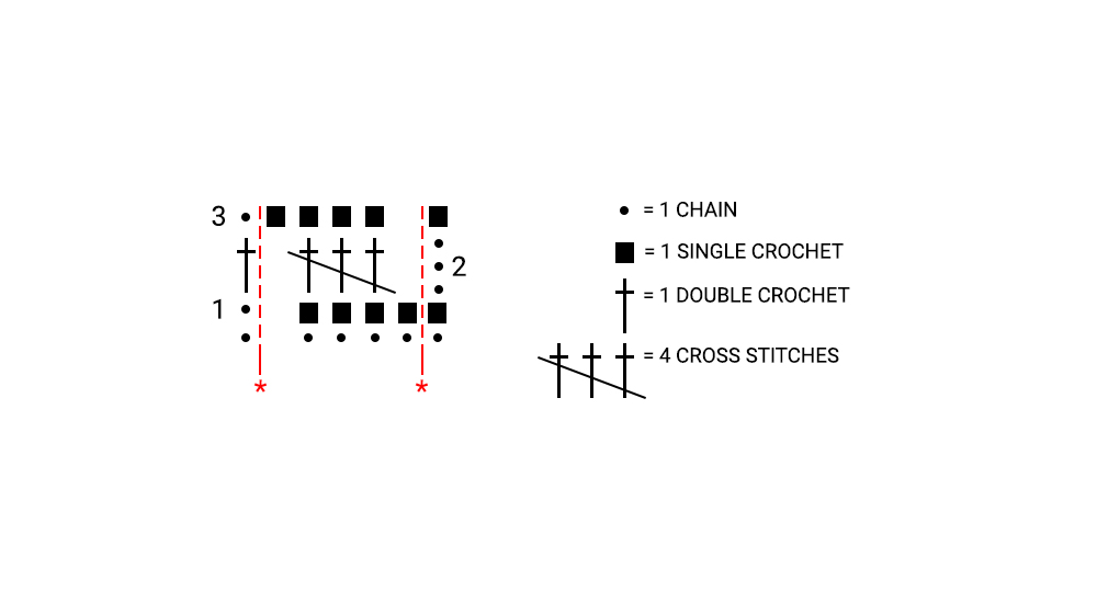 Start with the stitch that precedes the first *, repeat everything from * to * and end with the stitch that follows the second asterisk.