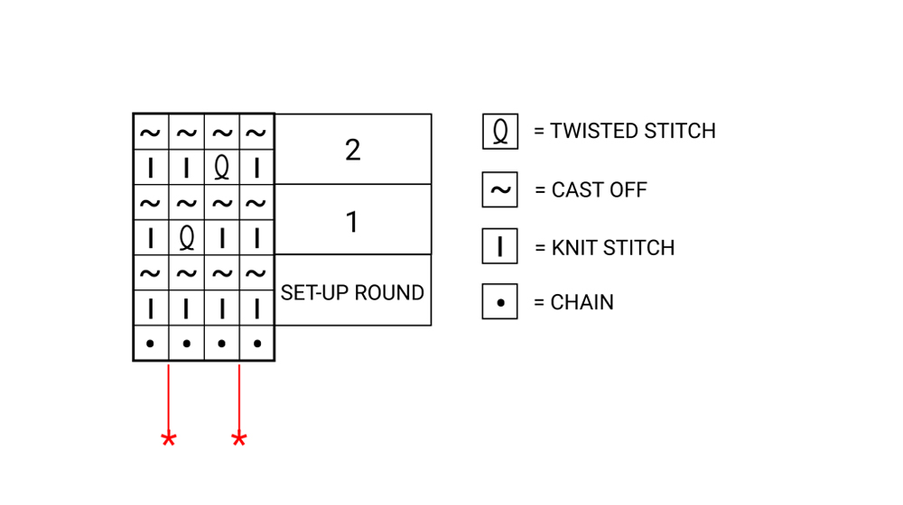 Forward pass: * twisted stitch 1, simple stitch 1 *, repeat from to * to until the last stitch, 1 edge stitch in the last stitch. Don’t turn the work over.