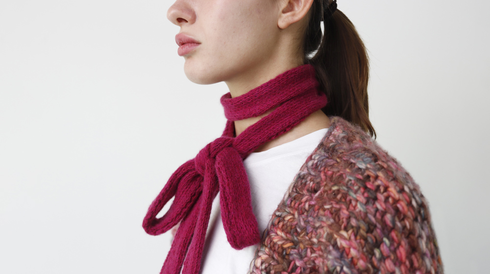 Here we paired the bow with a cardigan with worked sleeves made with Piuma yarn in the Monet color.
