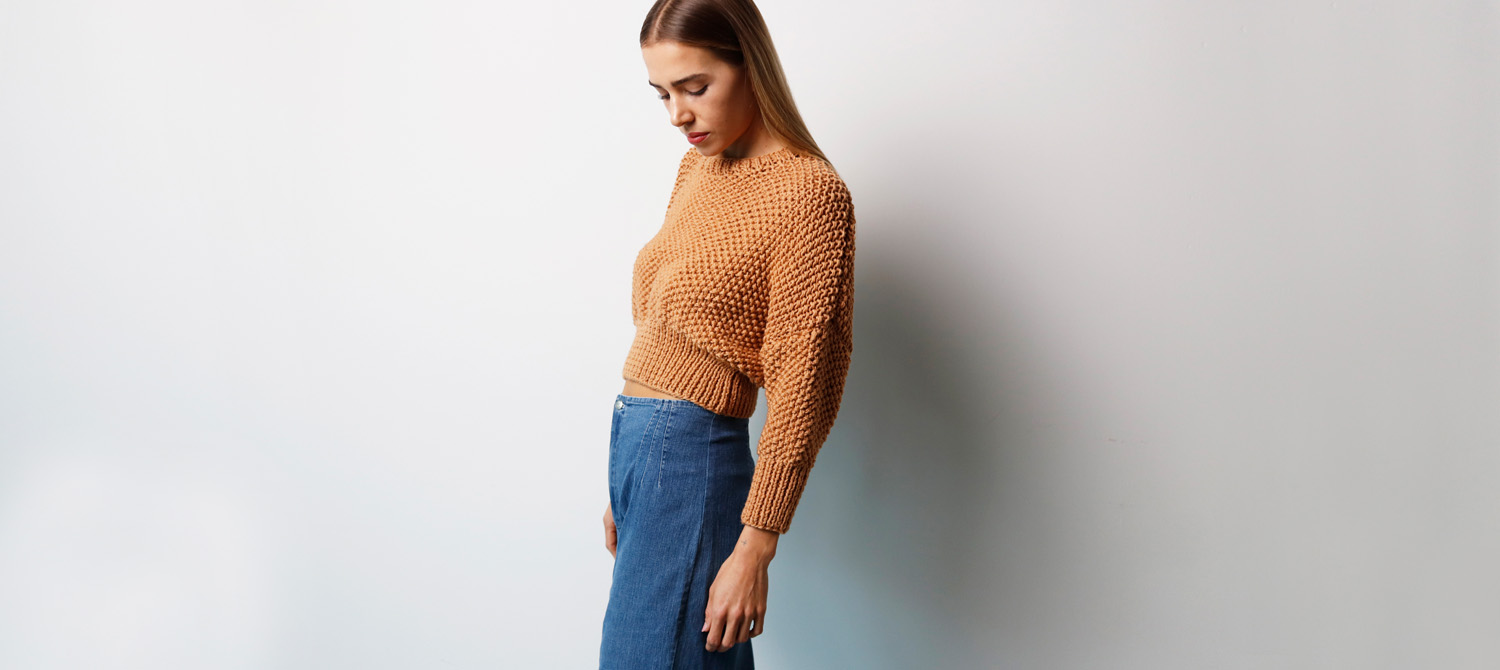 Let’s learn together how to knit a lovely crop sweater! All you need are a pair of needles, our Rain or Shine yarn, and of course, the pattern below. This project is perfect for those already skilled with knitting needles, so it’s not ideal for beginners. By the end, you’ll have a handmade crop sweater, perfect for pairing with high-waisted trousers, for example. Made with pure wool, since Rain or Shine is 100% merino wool. Warm yet lightweight.
