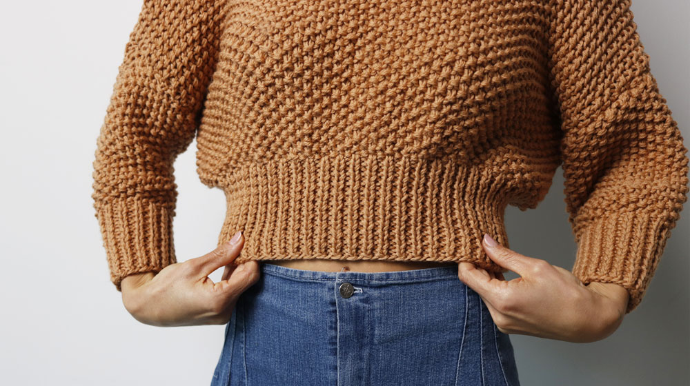 Sew the remaining shoulder and neckline edges. Attach each sleeve along its armhole, centering it on the shoulder seam. Sew the side seams and underarm seams. Your crop sweater is complete!