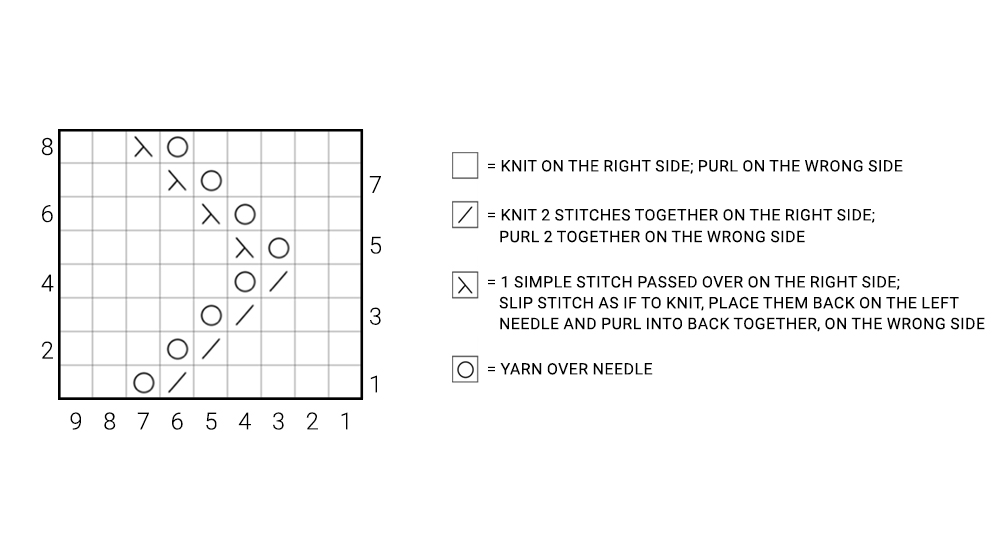 The diagram is read from the bottom up. When working in the round it is always read from right to left; when working flat it reads from right to left when working on the right side and from left to right when working on the wrong side. The odd rows are the right side, and the even ones are the wrong side.