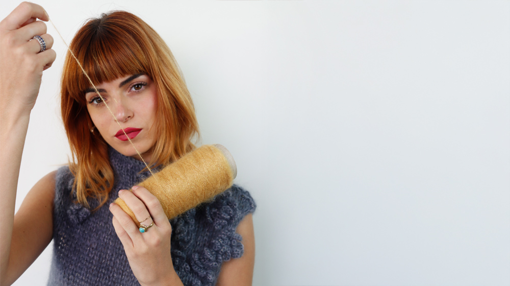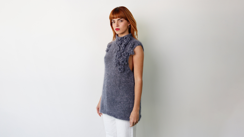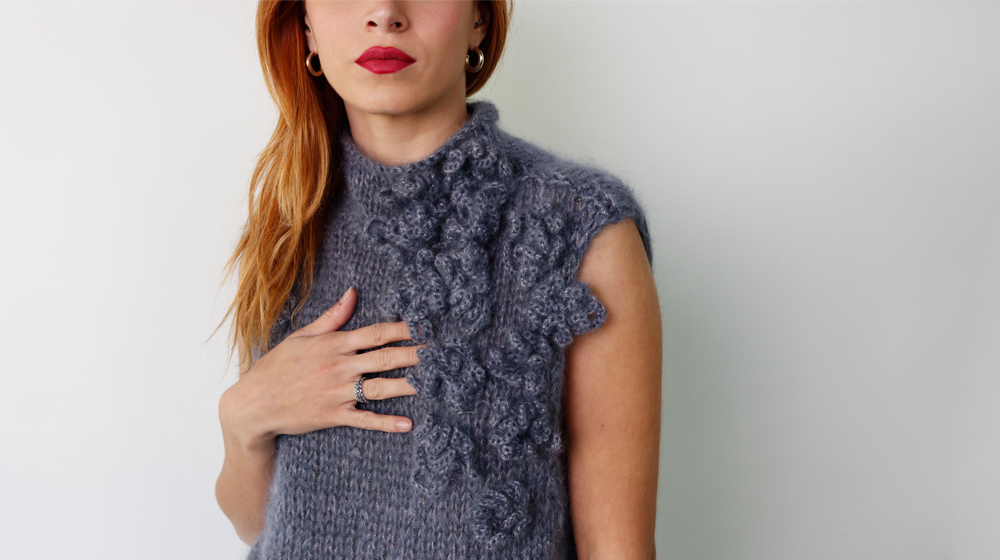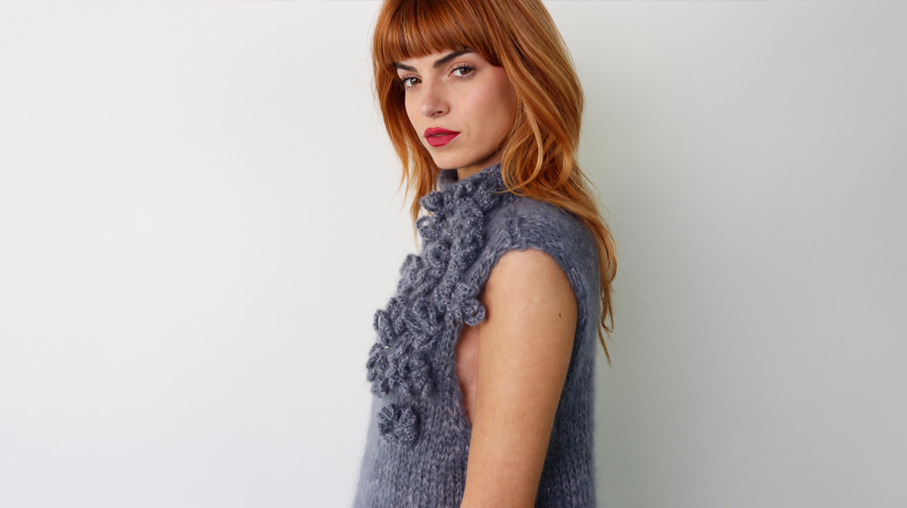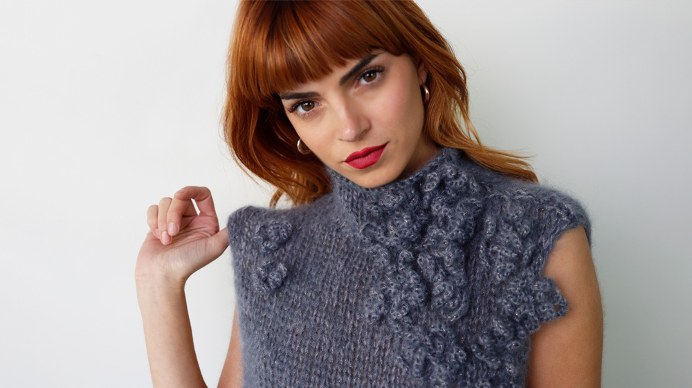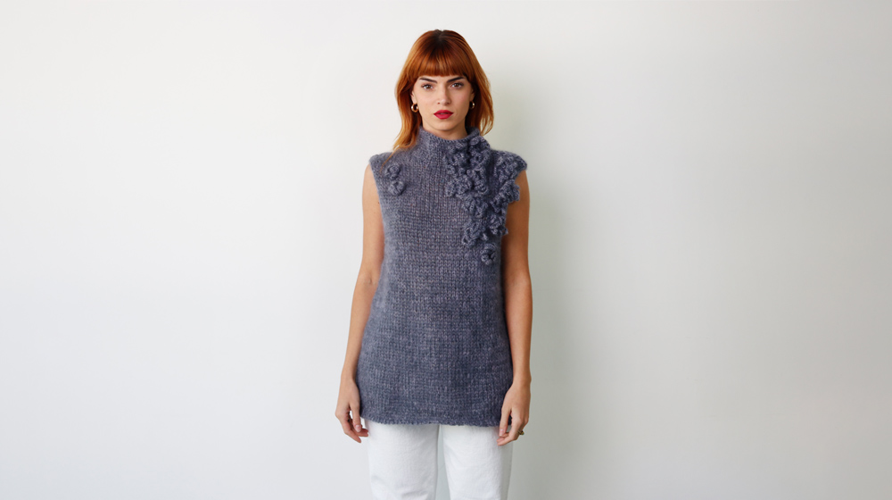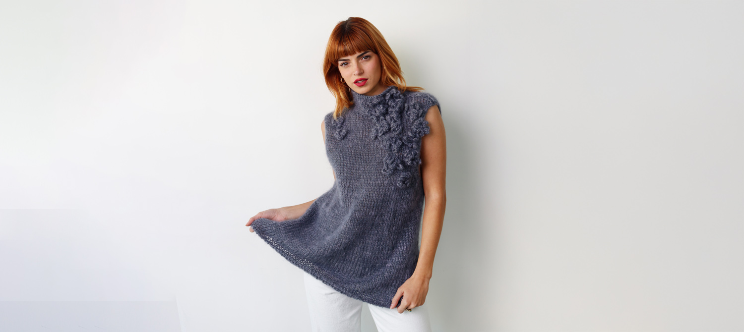 Today's pattern will guide you through making a truly extraordinary piece. A vest with applied flowers, utterly sophisticated. This vest requires working with both knitting needles and a crochet hook. The chosen yarn is the luxurious Fluffy lamé, made of silk and kid mohair. A true treat for the skin and a feast for the eyes. Here we've combined two colors, Storm and Mist, to create a new, more complex shade.
