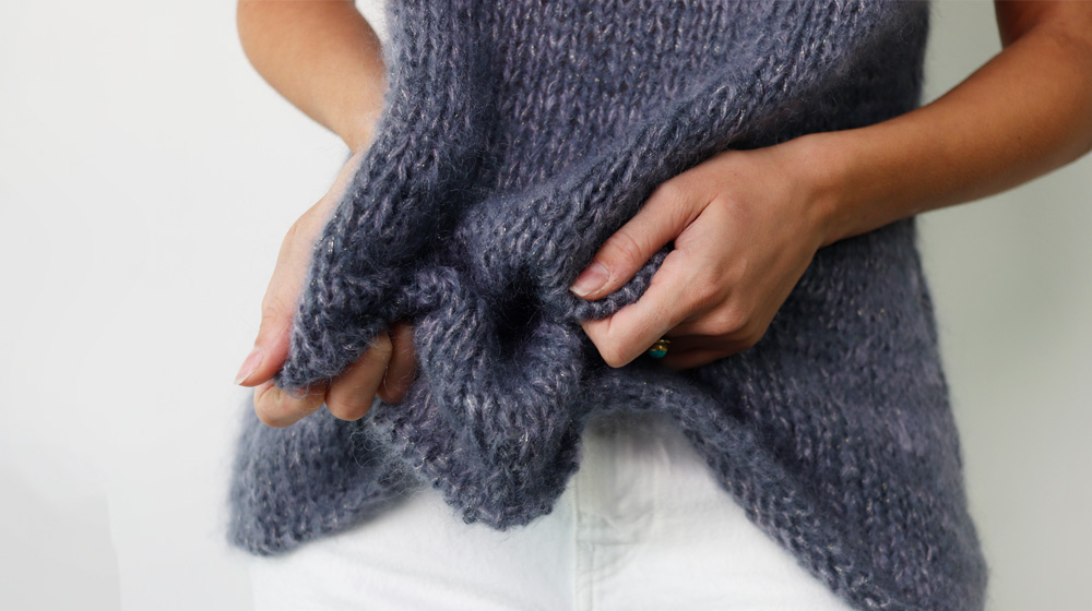Sew one shoulder, then work a chain stitch with crochet along the right side of the seam. For the neck, with knitting needles n° 4 EU / 6 US and the yarn held fourfold (2 strands of each of the 2 colors together), pick up stitches around the neckline and work in stockinette stitch for 10 rows, about 6 cm / 2.4". Bind off. Sew the other shoulder, then work a chain stitch with crochet along the right side of the seam. Close the neck side seam. Sew the side seams.