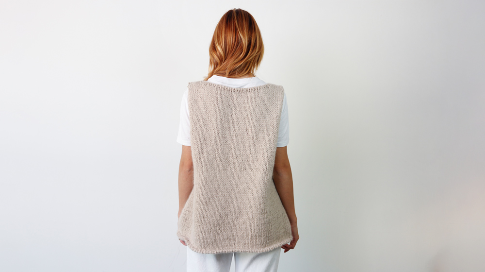 The vest is worked flat in 2 pieces, back and front. The edges are worked as you go, the front pockets are worked at the end by picking up the stitches that were put on hold.
