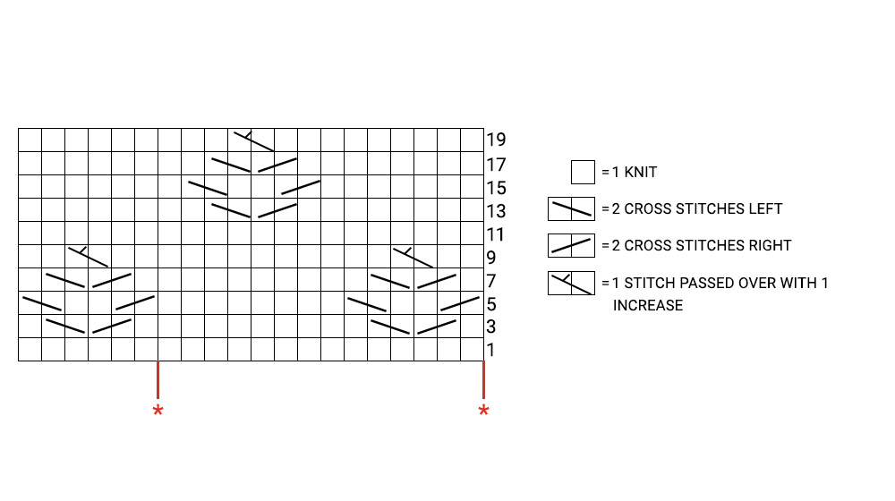 row 13 and 17: *knit 8, 2 cross stitches on the right, 2 cross stitches on the left, knit 2*, always repeat from * to * and finish with knit 6