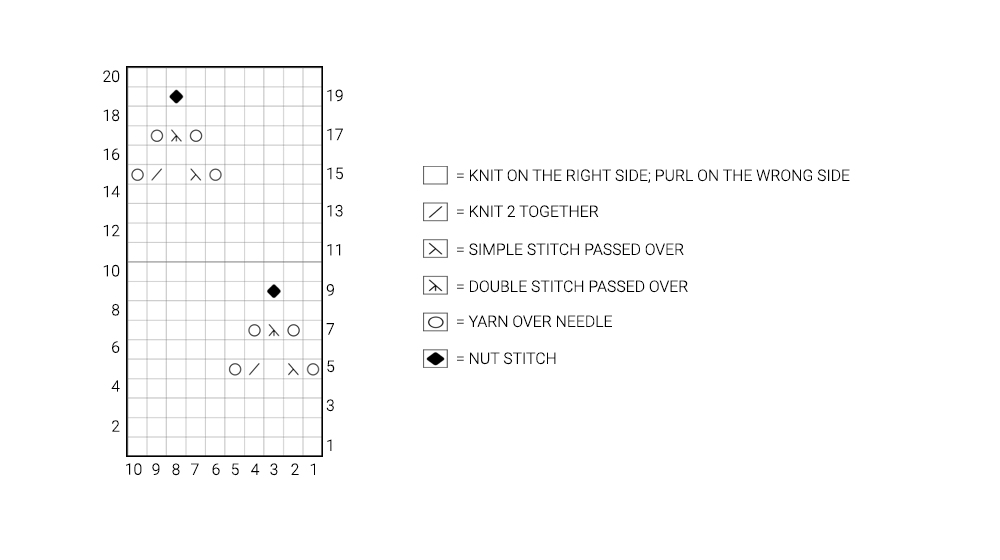 The diagram is read from the bottom up. When working in the round it is always read from right to left; when working flat it reads from right to left when working on the right side and from left to right when working on the wrong side. The odd rows are the right side, and the even ones are the wrong side.