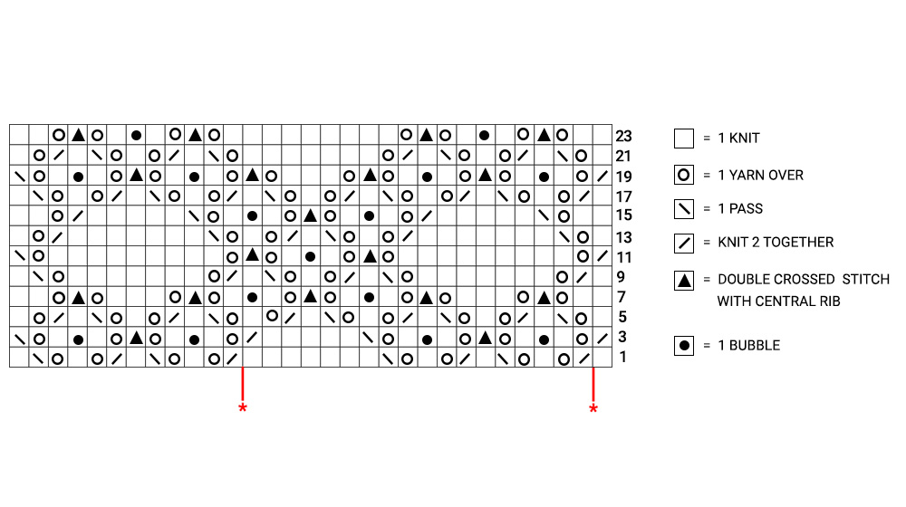 row 23: knit 1, *+knit 1, yarn over 1, double crossed stitch with central rib 1, yarn over 1, knit 1, nut stitch 1, knit 1, yarn over 1, double crossed stitch with central rib 1, yarn over 1+, knit 8*, bind off stitching from + to + 1 time, knit 2