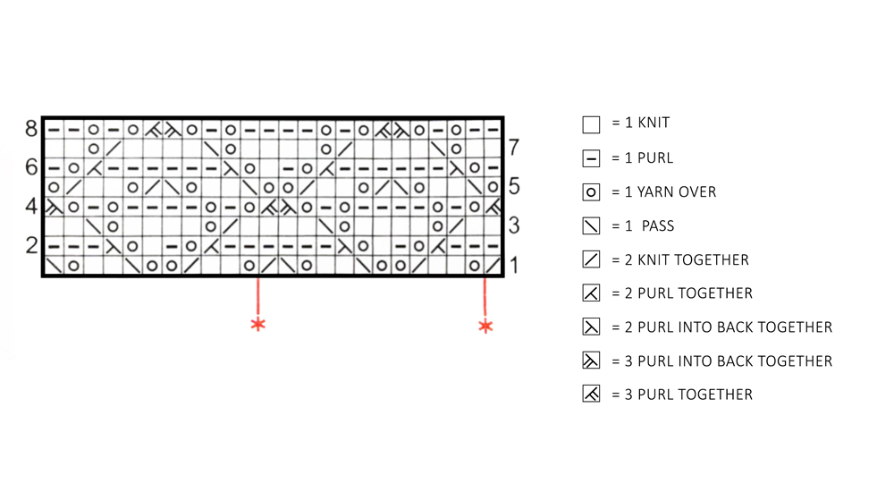 row 8: + 2 pass, 1 yarn over, 3 purl together, 3 purl into back together, 1 yarn over, 1 pass, 1 yarn over, 1 pass +, * 1 pass, work from to + to *, finish off with 1 pass.