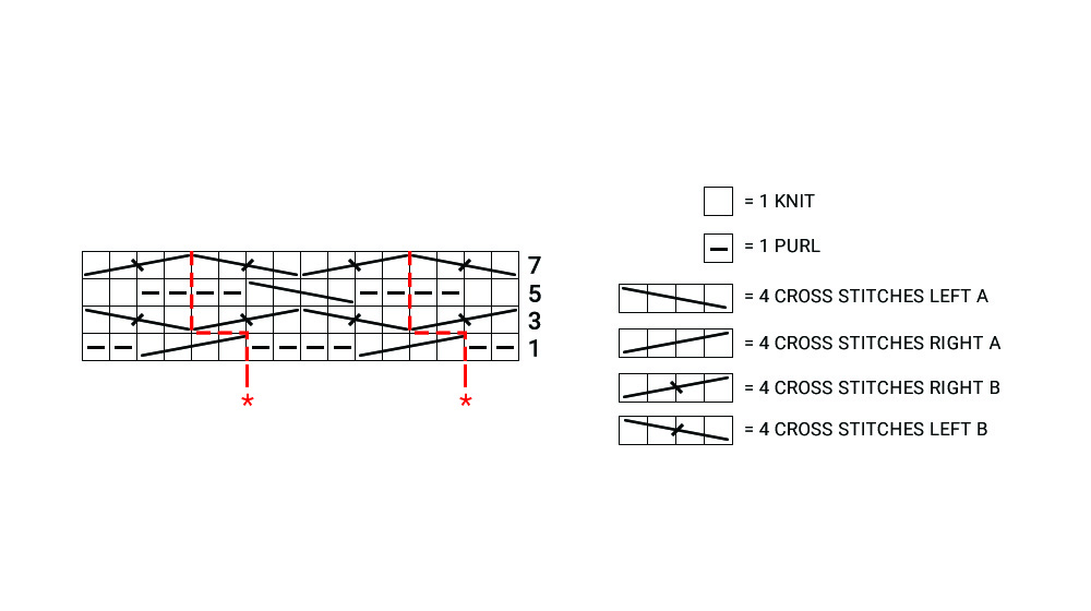 To carry out 4 cross stitches right B: keep 2 open stitches behind, knit 2, purl the 2 open stitches.