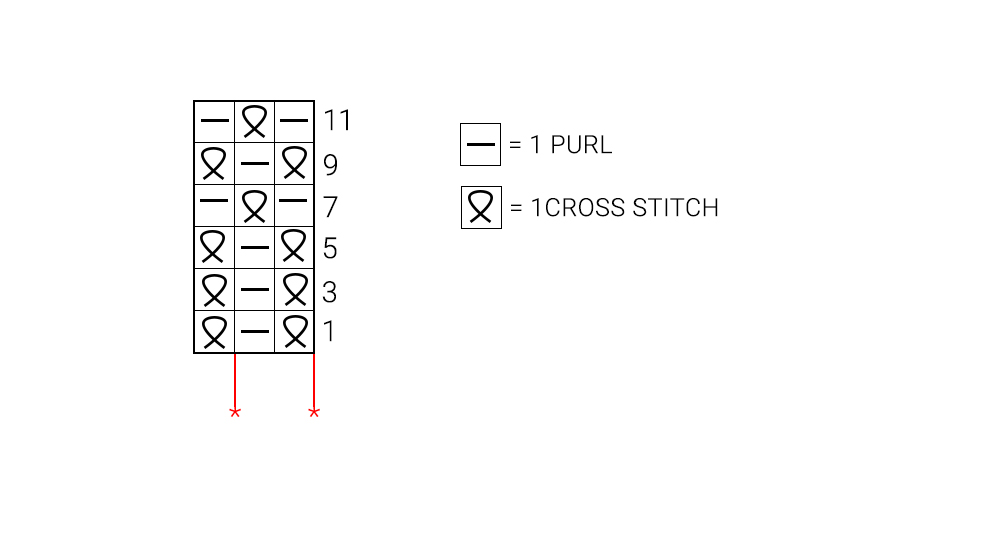 Rows 1, 3 and 5: *work 1 cross stitch, purl 1*, always repeat from * to * and finish with 1 cross stitch