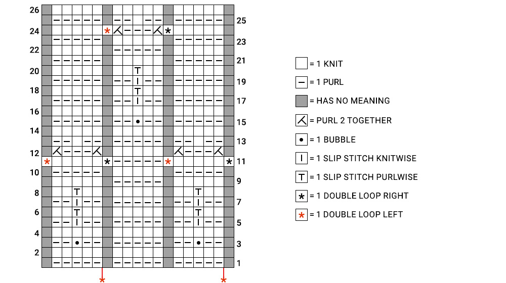 Repeat from * to * for the entire row and finish with the stitches that follow the second *, but on the 11th row start with the stitch before the first *, repeat from * to * for the entire row and finish with the stitches they follow the second *. The grey squares have no meaning and should not be considered when setting up the motif and during knitting.