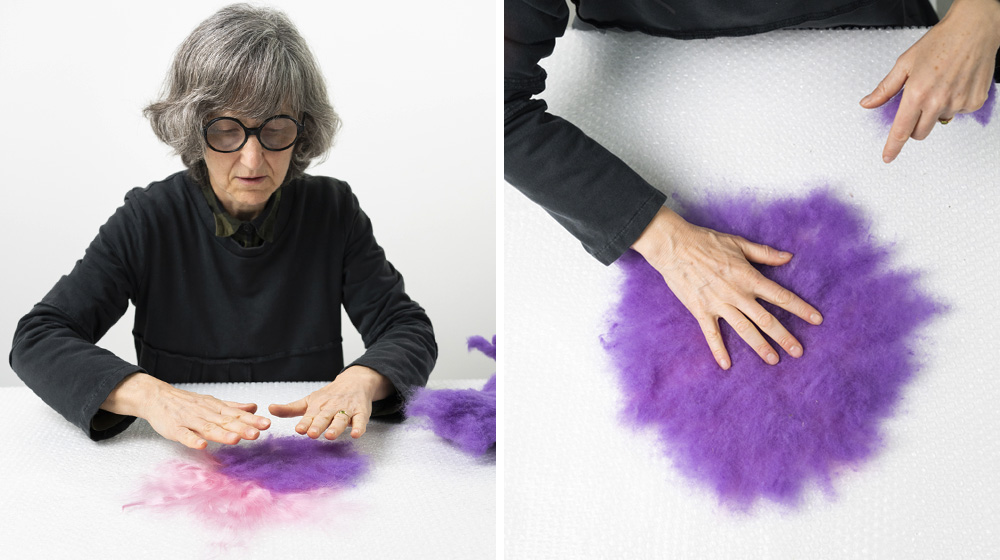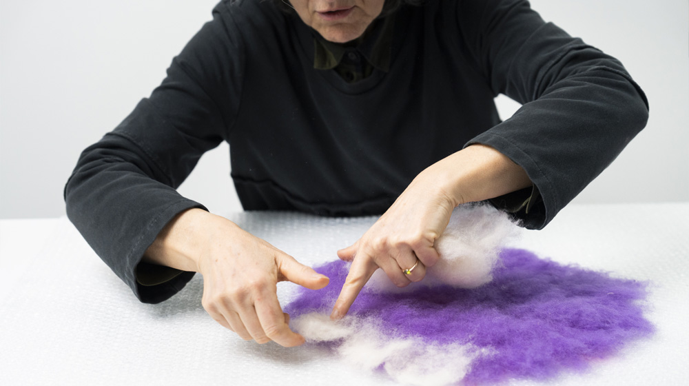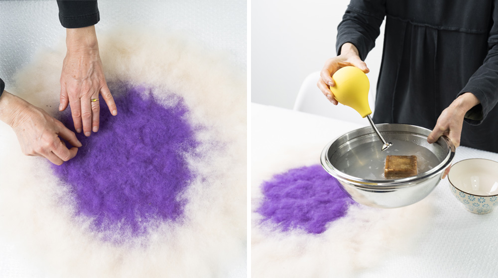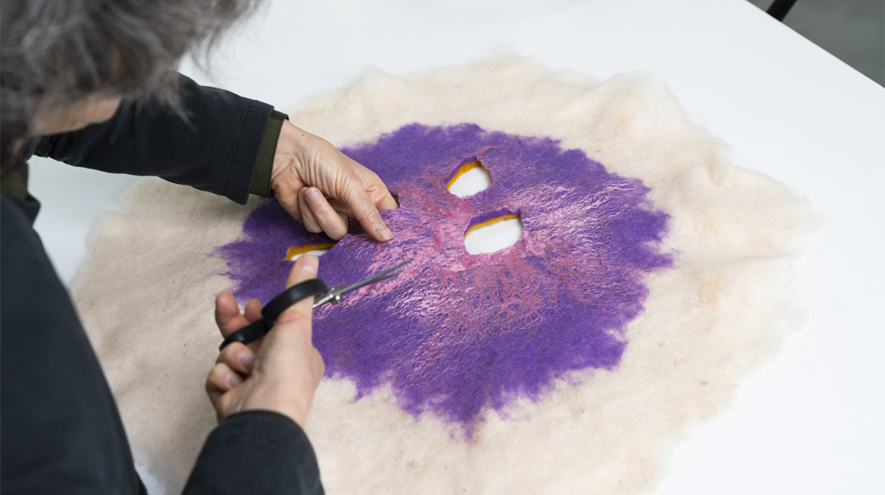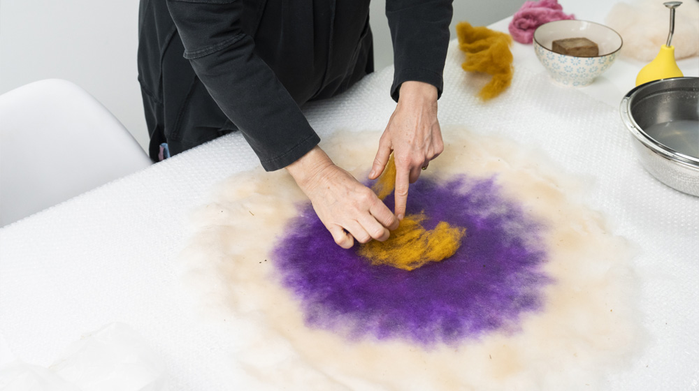 Today we’re going to learn how to make a double‑sided cushion using the wet felting technique with Bergschaf wool and viscose, together with Eva Basile, felt expert and master weaver.