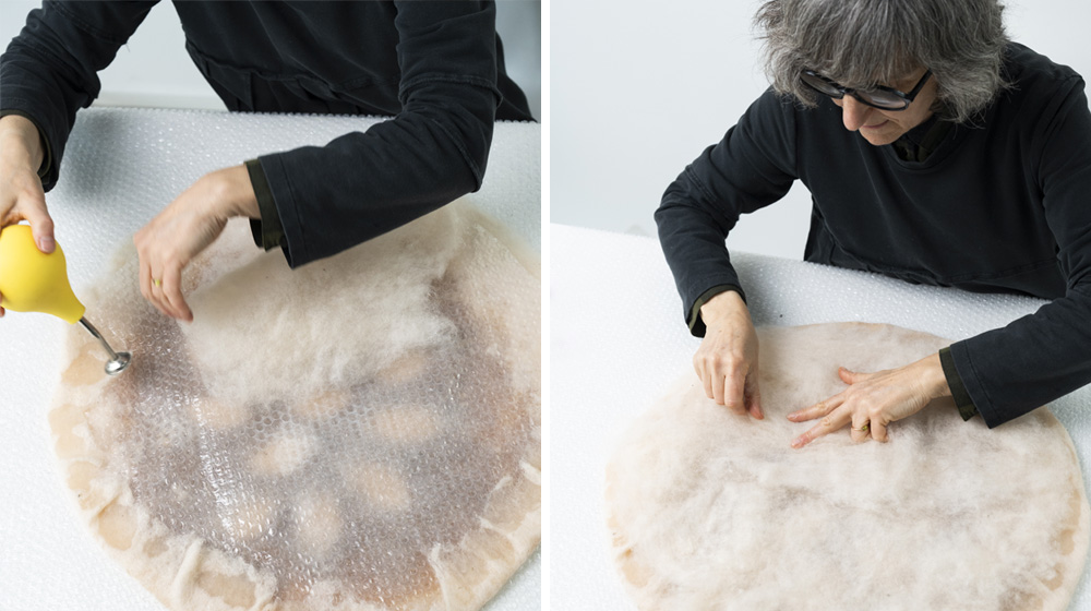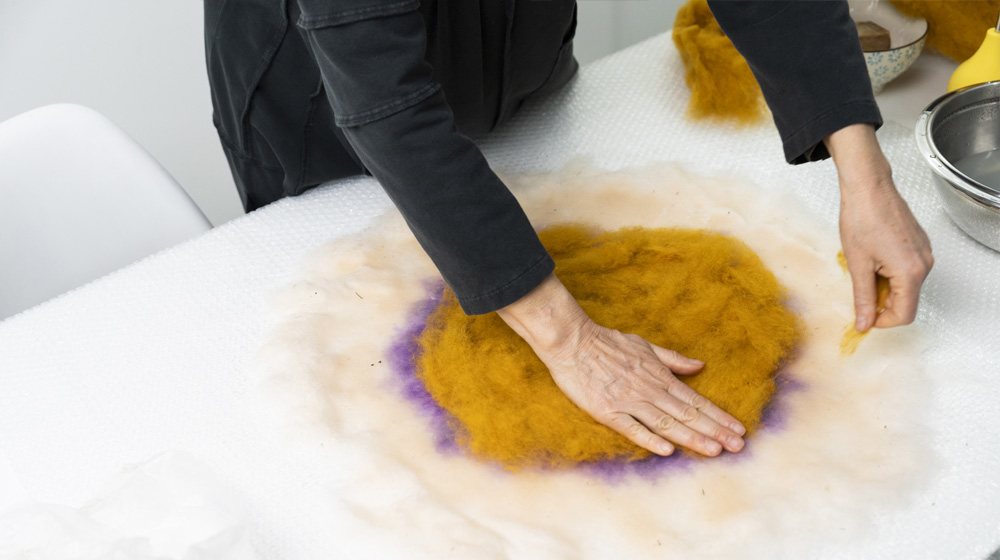 Cut a bubble cushioning wrap disc that must have a diameter slightly larger than the Saffron section and place it on top. Cover the bubble cushioning wrap all around the circumference with the already felted work edges and wet with soapy water, trying not to create large wrinkles. At this point, generously cover the entire surface with Bergschaf wool color Acacia, being careful not to go beyond the edge, and repeat the wet felting procedure again.