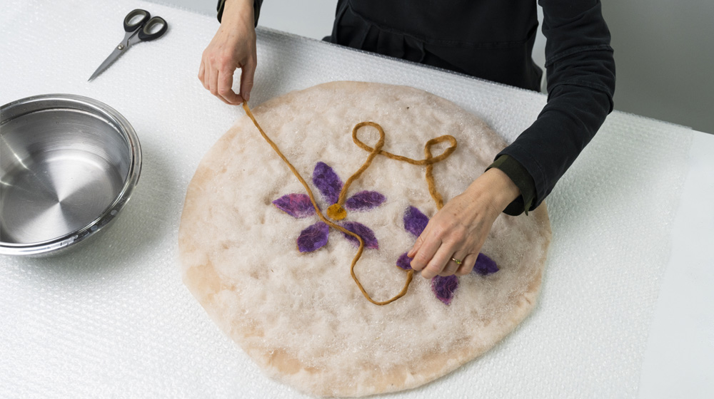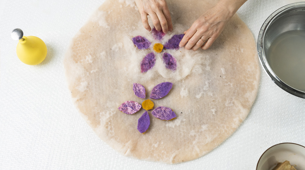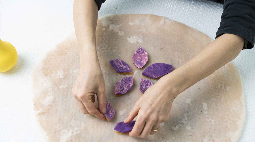 Apply the leaves you cut out onto the freshly felted surface, trying to form two flowers.